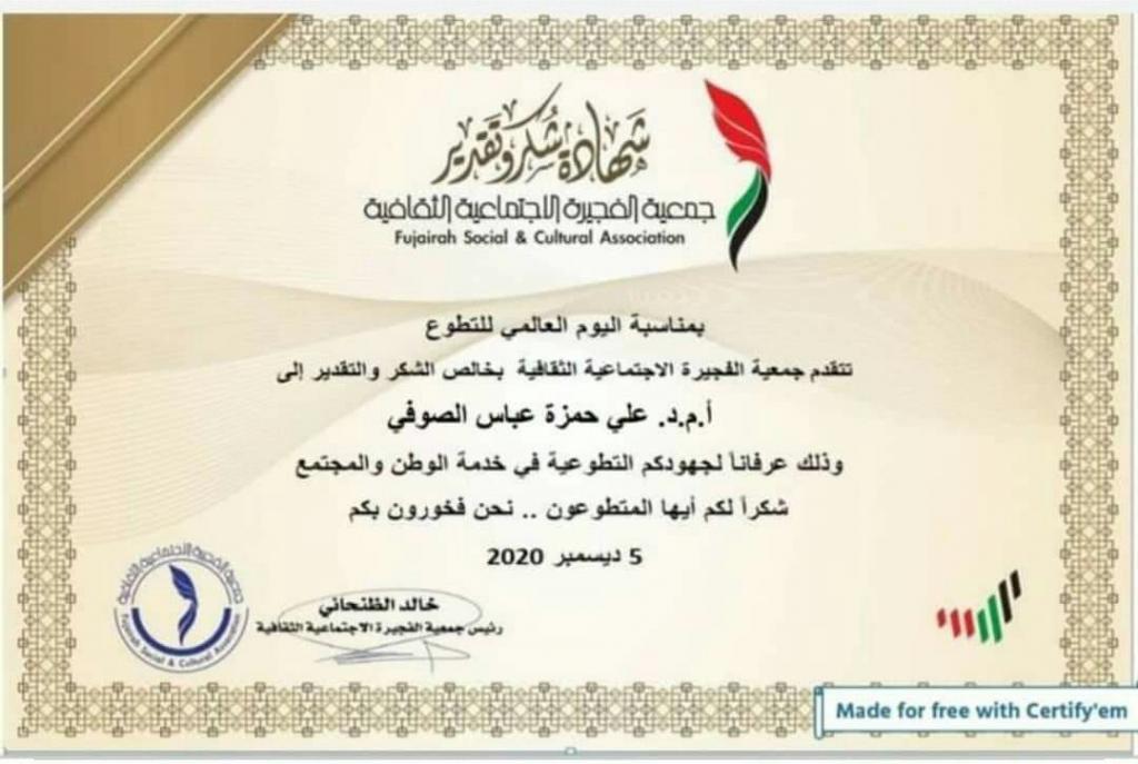 حصل أ.م.د. علي حمزة الصوفي من قسم التاريخ في كلية التربية الاساسية على شهادة شكر وتقدير من جمعية الفجيرة الاجتماعية الثقافية بمناسبة اليوم العالمي للتطوع وذلك عرفا لجهوده التطوعية في خدمة الوطن والمجتمع