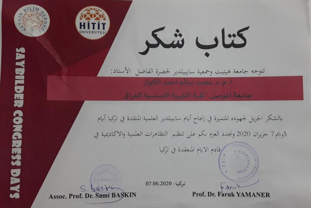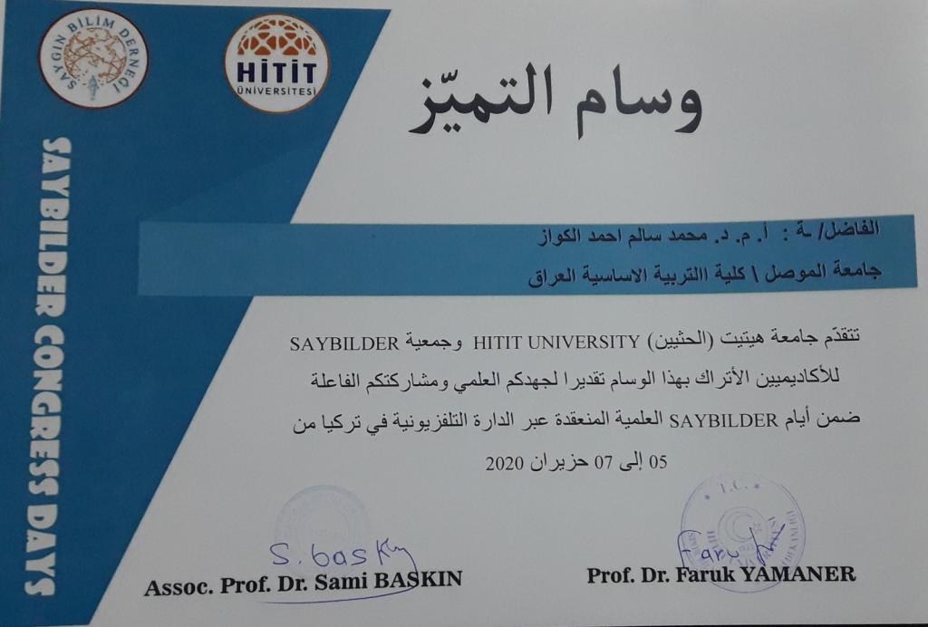 حصول أ.م.د. محمد سالم احمد الكواز من كلية التربية الاساسية على شهادة مشاركة وكتاب شكر ودرع تميز في مؤتمر دولي افتراضي في تركيا