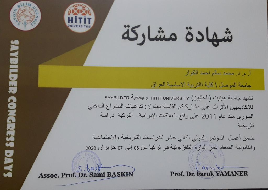 حصل أ.م.د. محمد سالم احمد الكواز من قسم الجغرافية في كلية التربية الاساسية على شهادة مشاركة وكتاب شكر لمشاركته في اعمال المؤتمر الدولي الثاني عشر للدراسات التاريخية والقانونية الذي اقامته جامعة هيتيت التركية وجمعية SAYBILDER للأكاديمين الاتراك عبر الفضاء الالكتروني حيث تمت المداخلات والمناقشات العلمية والاجابة على جميع الاسئلة الموجهة من قبل المشاركين في جميع هذه المشاركات ، وايضا تم حصول الدكتور محمد الكواز على درع التميز من جامعة هيتيت لمساهمته الفعالة في اعمال المؤتمر الدولي الثاني عشر التي اقيم فيها .