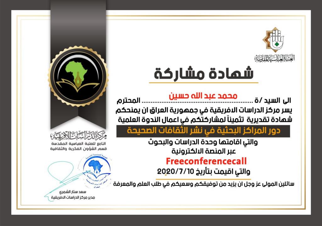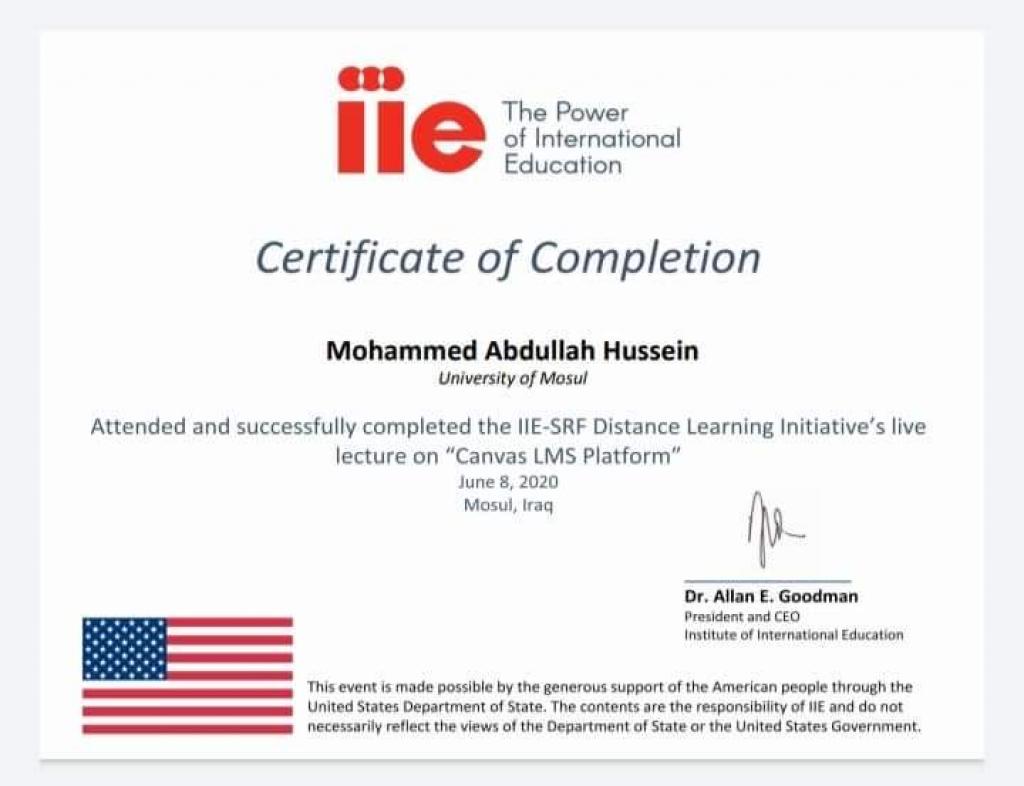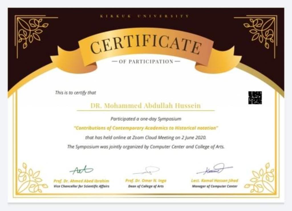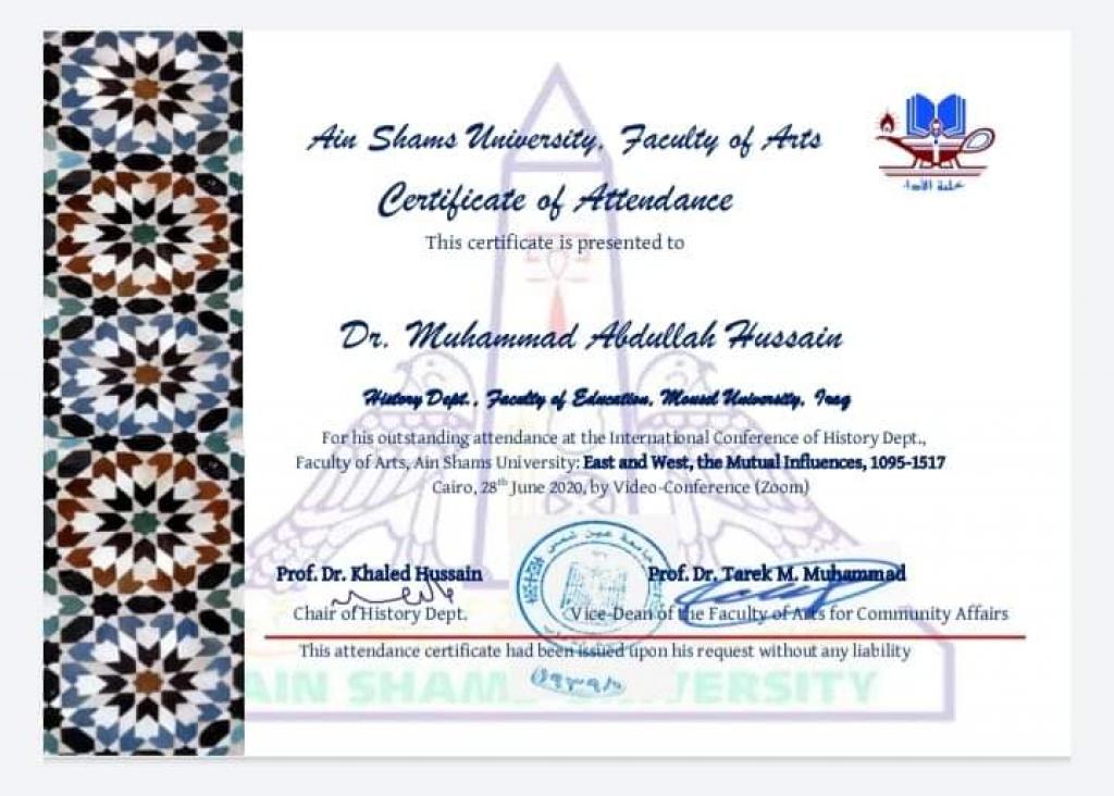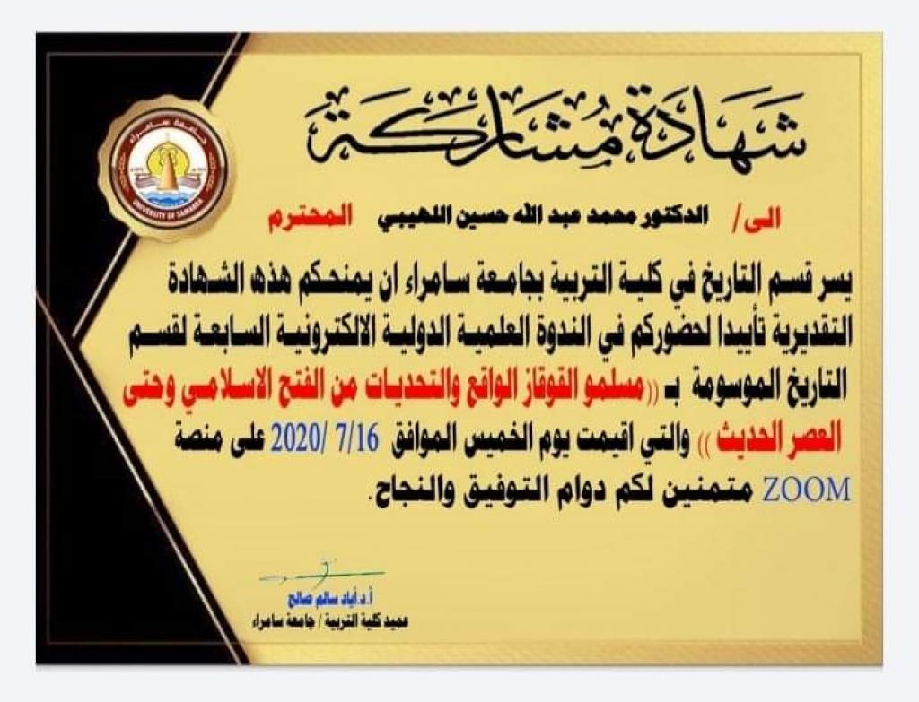 حصل أ.م.د. محمد عبد الله اللهيبي من قسم التاريخ في كلية التربية الاساسية على شهادات مشاركة في ندوات وورش عمل علمية دولية عبر الفضاء الالكتروني حيث تمت المداخلات والمناقشات العلمية والاجابة على جميع الاسئلة الموجهة من قبل المشاركين في جميع هذه المشاركات .