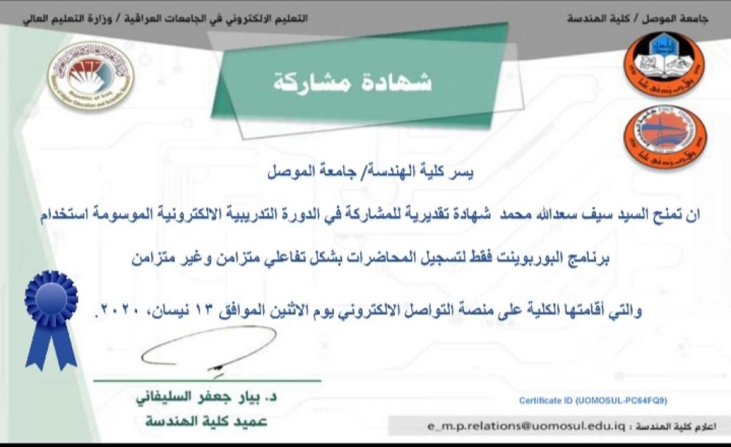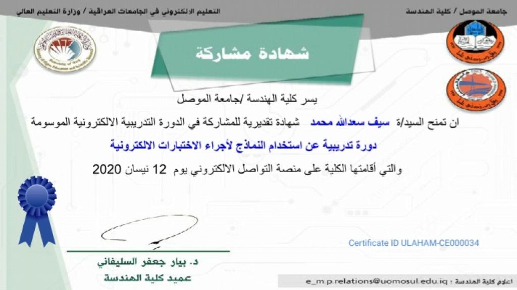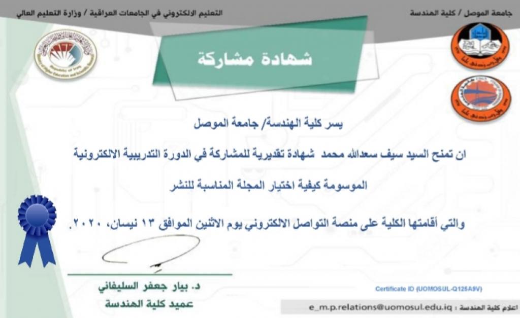 تحقيقا للتفاعل النشط مع الدورات والورش التدريبية حصل م.م.سيف سعدالله محمد التدريسي في قسم اللغة العربية / كلية التربية الاساسية على أربع شهادات مشاركة بالدورات وورش العمل الإفتراضية التي أقيمت على منصات متعددة في جامعة الموصل في كلية الهندسة وكلية الإدارة والاقتصاد .