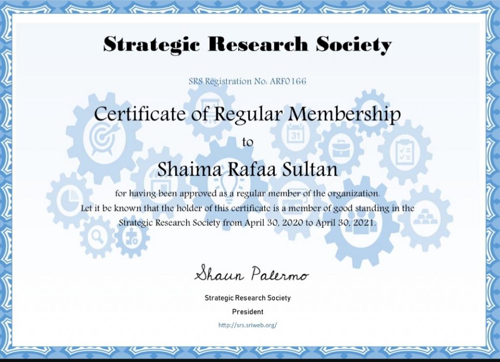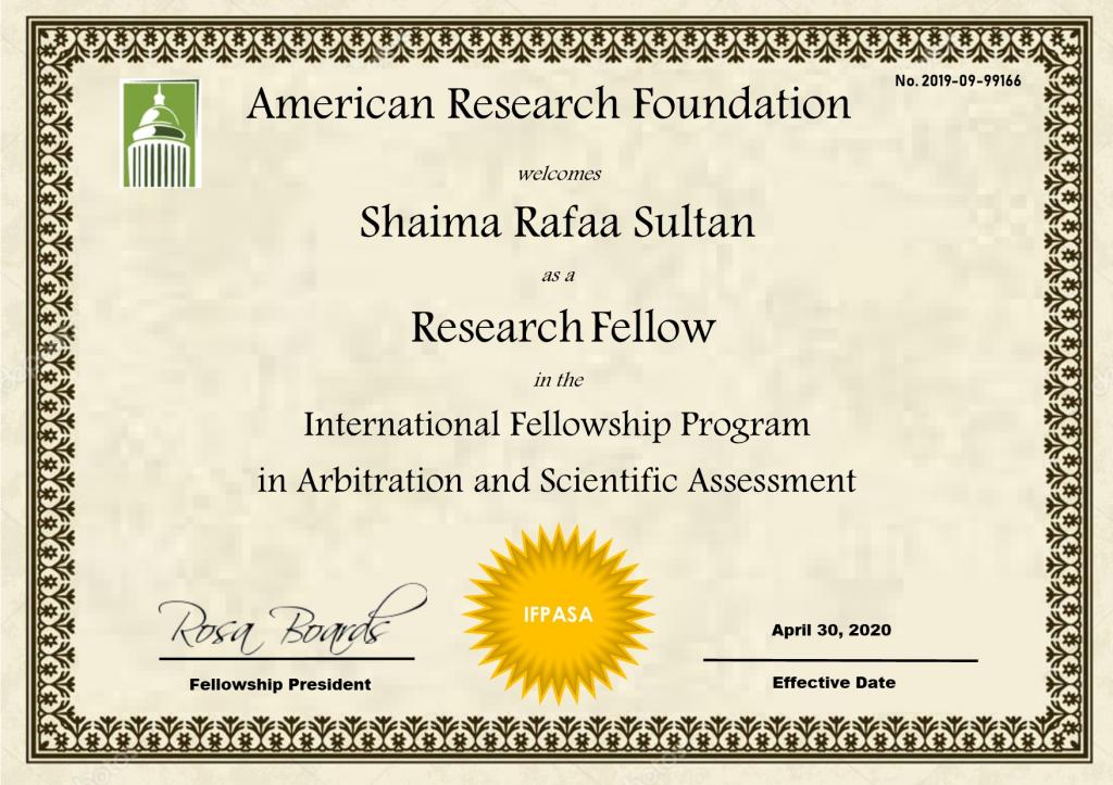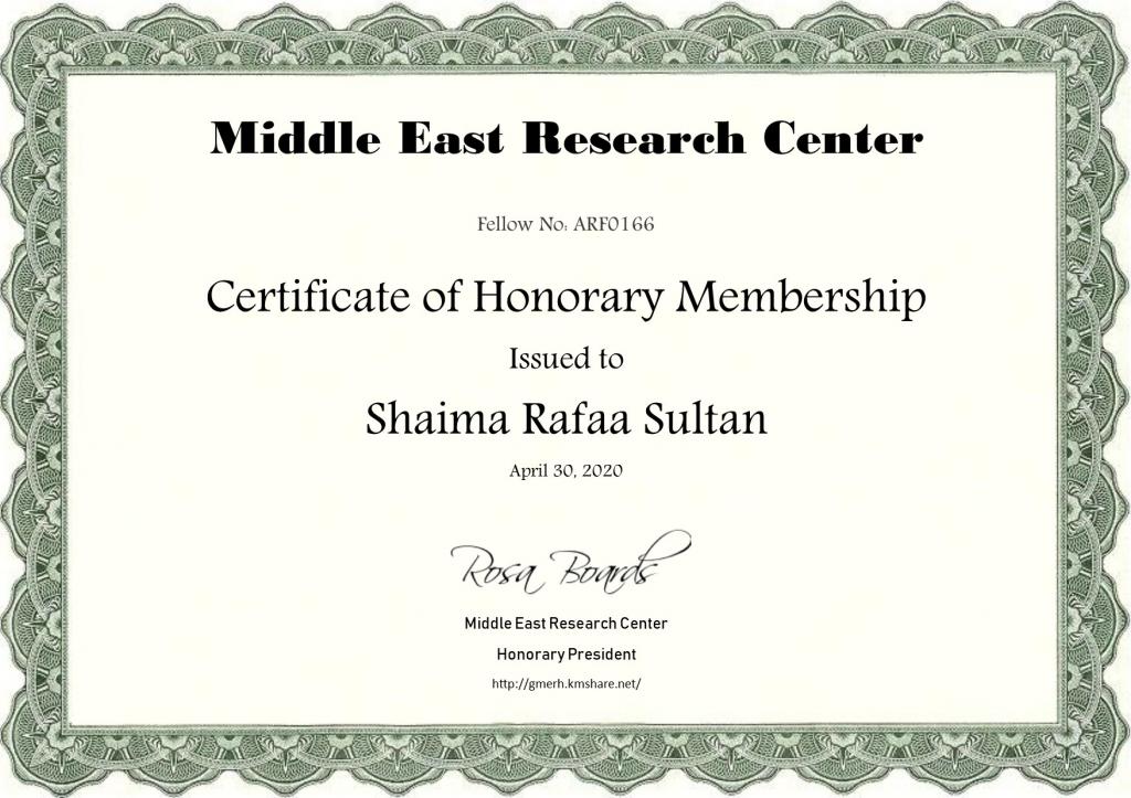 حصلت م. شيماء رافع سلطان التدريسية في قسم التاريخ في كلية التربية الاساسية على زمالة في التحكيم والتقييم العلمي الدولي التابع للمؤسسة الأمريكية للابحاث ، أضافة الى حصولها على زمالة مركز بحوث الشرق الاوسط وزمالة جمعية البحوث الاستراتيجية ، والذي تديره في منطقة الشرق الاوسط وشمال افريقيا شبكة المؤتمرات العربية والتي تدعو المؤسسات البحثية والجامعات ومحرري المجلات العلمية ومنظمي المؤتمرات الاستفادة من خبرات هؤلاء المحكمين لمراجعة وتحكيم الابحاث والاوراق العلمية ومعاملات الترقية ، يذكر بان للتدريسية شيماء رافع عدة مشاركات في مؤتمرات وندوات علمية محلية ودولية وايضاً حصولها على شهادات مشاركة وكتب شكر بذلك .