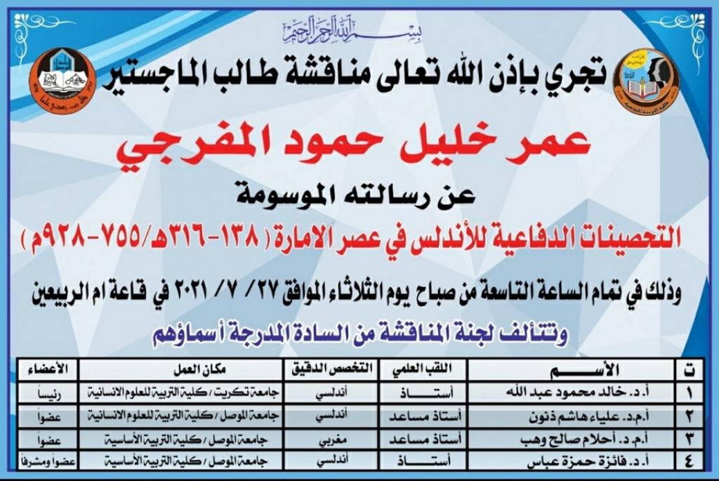 ناقش قسم التاريخ في كلية التربية الاساسية بجامعة الموصل رسالة الماجستيـــر الموسومة ( التحصينات الدفاعية للأندلس في عصر الامارة 138 – 316 هـ / 755 – 928 م ) للطالب ( عمر خليل حمود المفرجي ) من قسم التاريخ صباح يوم الثلاثاء الموافق 27 تموز 2021 وعلى قاعة ام الربيعين ، حضر جانبا منها السيد عميد الكلية الأستاذ المساعد الدكتور صفاء الدين عبد الله سليمان ومعاوني عميد الكلية العلمي والإداري الأستاذ الدكتور محمد توفيق عثمان والأستاذ المساعد الدكتور محمد يونس صالح الجريسي وعدد من رؤساء الأقسام في الكلية وتألفت لجنة المناقشة من السادة : أ.د خالد محمود عبدالله / كلية التربية للعلوم الانسانية جامعة تكريت / (رئيساً ) ، أ.م .د علياء هاشم ذنون/ كلية التربية للعلوم الانسانية جامعة الموصل (عضواً) ، أ.م .د احلام صالح وهب /كلية التربية الأساسية جامعة الموصل ( عضواً ) ، أ.د فائزة حمزة عباس كلية التربية الأساسية /جامعة الموصل. (عضواً و مشرفاً) .تناولت هذه الدراسة التحصينات الدفاعية للأندلس في عصر الإمارة (138-316ه/755-928م) لتسليط الضوء على اهم الوسائل الدفاعية التي استخدمتها الاندلس للوقوف بوجه اعدائها وكيفية تدعيم دفاعاتها البرية والبحرية، ومعرفة دور التحصينات الدفاعية ومدى تأثيرها في سيادة الاندلس والمحافظة على امنها واستقرارها. فقد قسمت الدراسة الى مقدمة وأربعة فصول فضلاً عن الخاتمة والملاحق.تناول الفصل الأول أسس قيام التحصينات الدفاعية للأندلس من حيث طبيعتها الجغرافية وتحصيناتها الطبيعية، والتطورات السياسية منذ دخول عبد الرحمن بن معاوية وتأسيس الإمارة فضلاً عن العامل العسكري والديني الذي استندت عليه سيادة البلاد، في حين خصص الفصل الثاني للحديث عن الثغور والربط او الرباطات وأهميتها الدينية والعسكرية. في حين عني الفصل الثالث بالأنماط العمرانية للتحصينات الدفاعية فتناول الأسوار والحصون والقلاع وتوضيح دور كل نمط في صد الهجمات الخارجية وتحصين المدن الاندلسية، وكرس الفصل الرابع للحديث عن التحصينات الدفاعية البحرية إذ تناول نشوءها ثم الحديث عن الاساطيل البحرية فضلاً عن قيادة الاساطيل الاندلسية وانواع السفن في الاسطول الاندلسي والتطرق الى اهم الاسلحة البحرية وتعبئة الاسطول الاندلسي .