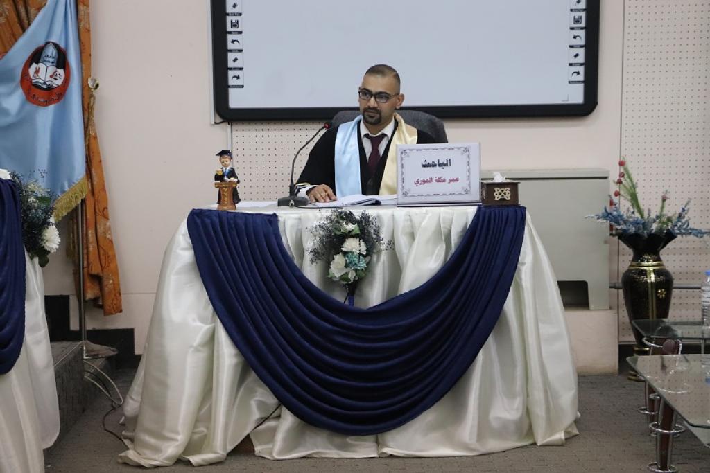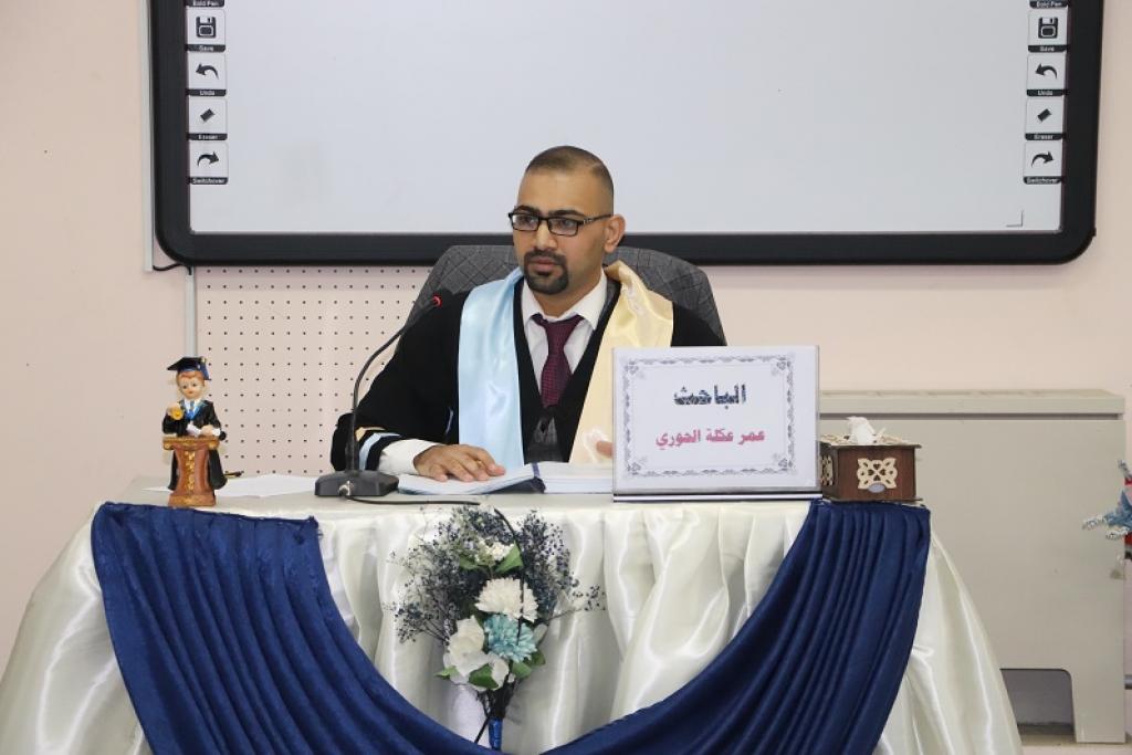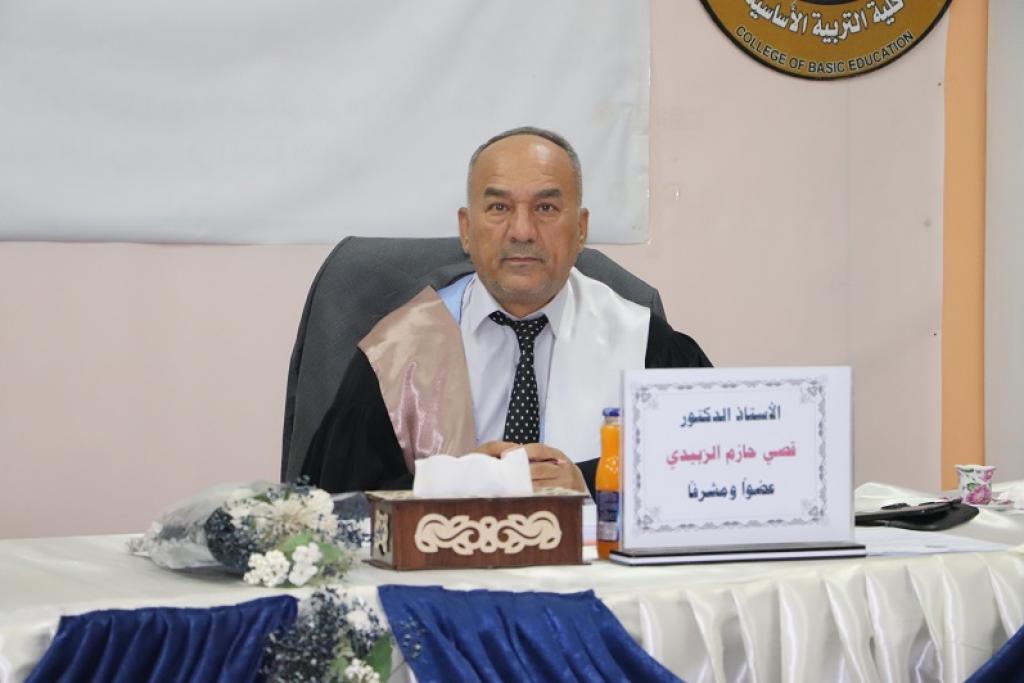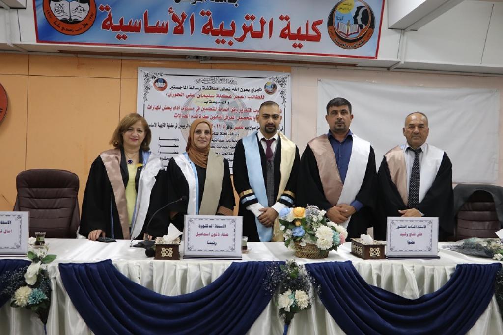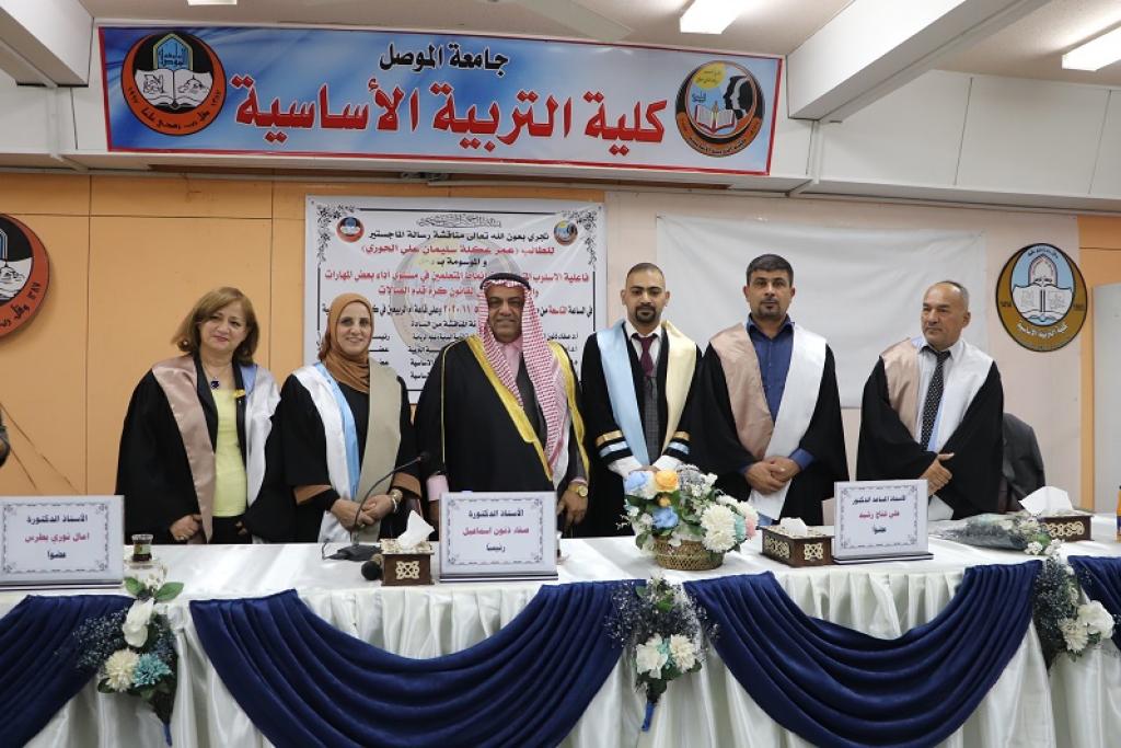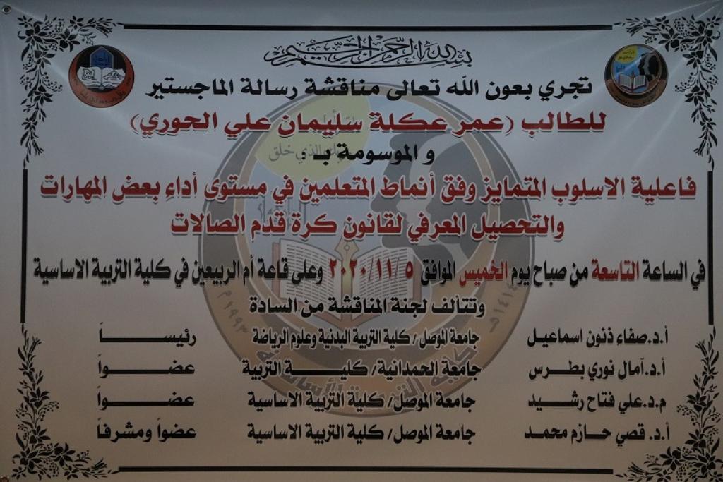 حضر السيد عميد كلية التربية الأساسية الأستاذ الدكتور صفاء الدين عبد الله سليمان المحترم والاستاذ الدكتور محمد توفيق عثمان آل حسين معاون العمدي للشؤون العلمية والدكتور محمد يونس صالح معاون العميد للشؤون الإدارية مناقشة طالب الماجستير ( عمر عكلة سليمان الحوري) من قسم التربية البدنية وعلوم الرياضة – كلية التربية الأساسية عن رسالته الموسومة ( فاعلية الأسلوب المتمايز وفق أنماط المتعلمين في مستوى أداء بعض المهارات والتحصيل المعرفي لقانون كرة قدم الصالات ) وذلك بالساعة التاسعة من صباح يوم الخميس الموافق 5 /11/2020 وعلى قاعة ام الربيعين في الكليـــة ، وتألفت لجنة المناقشة من السادة :