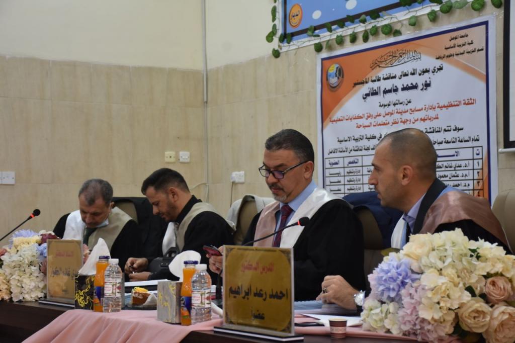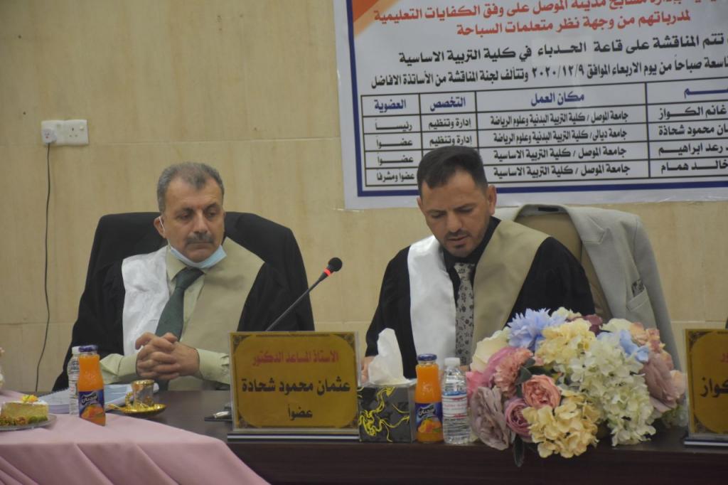 ناقش قسم التربية البدنية وعلوم الرياضة في كلية التربية الاساسية بجامعة الموصل رسالة الماجستير الموسومة ( الثقة التنظيمية لمسابح مدينة الموصل على وفق الكفايات التعليمية لمدرباتهم من وجهة نظر متعلمات السباحة ) للطالبة نور محمد جاسم من قسم التربية البدنية وعلوم الرياضة صباح يوم الاربعاء الموافق 9 كانون الاول 2020 وعلى قاعة الحدباء في الكلية ، حضر جانبا منها السيد عميد كلية التربية الأساسية الأستاذ المساعد الدكتور صفاء الدين عبد الله سليمان ومعاوني العميد العلمي والإداري الأستاذ الدكتور محمد توفيق عثمان آل حسين والدكتور محمد يونس صالح الجريسي ، وترأس لجنة المناقشة أ.د. عدي غانم الكواز وعضوية أ.م.د. عثمان محمود شحاذة و م.د. احمد رعد ابراهيم و ا.د. وليد خالد همام عضواً ومشرفاً .وتناولت الرسالة موضوع الاقبال الكبير من قبل الاناث من مدينه الموصل على الاشتراك في الدورات التعليمية للسباحة نتيجة الثقة الكبيرة بإدارات المسابح والثقة المتبادلة مع المدربات وبين المتعلمات انفسهم ..وامتلاك المدربات الكفايات التعليمية العالية لنجاح هذه الدورات التعليمية في رياضه السباحة…خصوصا بعد الاقبال الكبير لمتعلمات السباحة بعد حادثه غرق العبارة في مدينه الموصل…وقد منحت الطالبة شهاده الماجستير بتفوق…مبارك للطالبة وللجنه المناقشة ..كل التوفيق