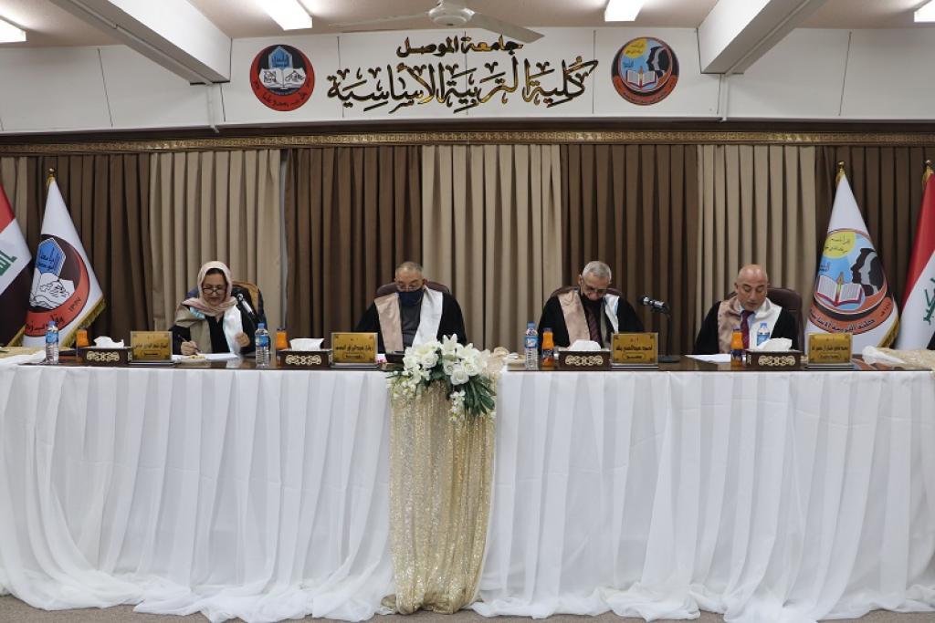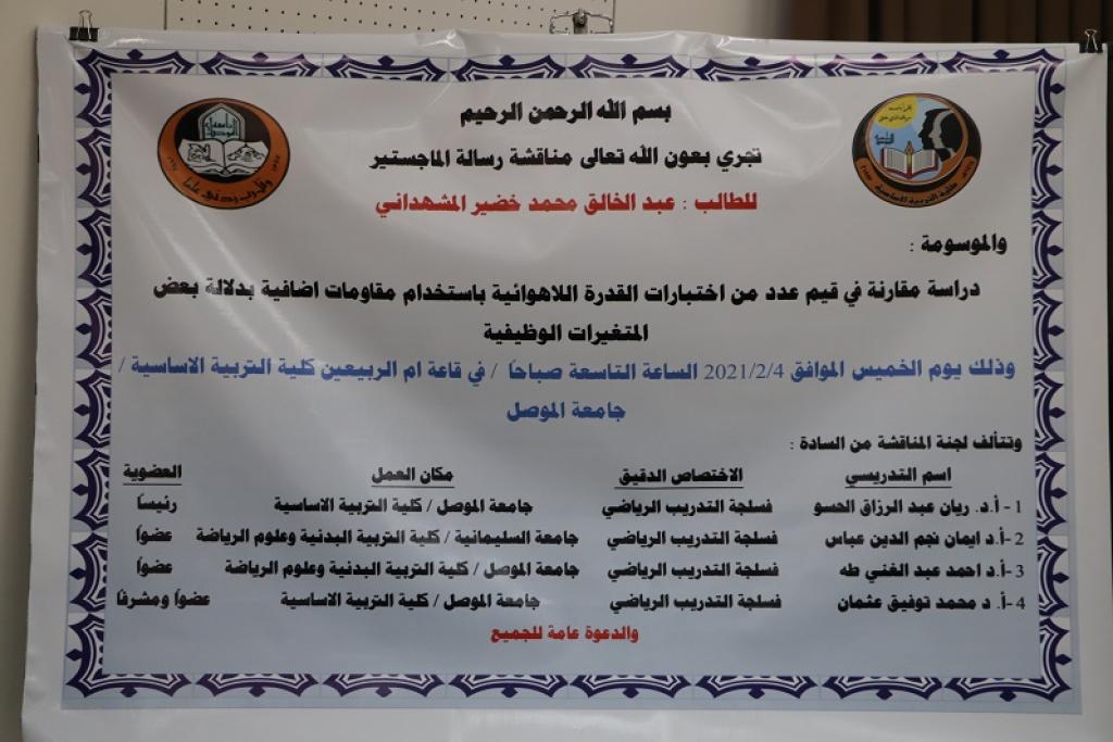 ناقش قسم التربية البدنية وعلوم الرياضة في كلية التربية الاساسية بجامعة الموصل رسالة الماجستير الموسومة (دراسة مقارنة في قيم عدد من الاختبارات القدرة اللاهوائية باستخدام مقاومات إضافية بدلالة بعض المتغيرات الوظيفية ) للطالب عبد الخالق محمد خضر من قسم التربية البدنية وعلوم الرياضة صباح يوم الخميس الموافق 4 شباط 2020 وعلى قاعة ام الربيعين في الكلية ، حضر جانبا منها السيد عميد كلية التربية الأساسية الأستاذ المساعد الدكتور صفاء الدين عبد الله سليمان ومعاون العميد الإداري الدكتور محمد يونس صالح الجريسي ، وترأس لجنة المناقشة أ.د. ريان عبد الرزاق الحسو وعضوية أ.د. ايمان نجم الدين عباس و ا.د. احمد عبد الغني طه و الأستاذ الدكتور محمد توفيق عثمان آل حسين عضواً ومشرفاً . وكرم السيد العميد أعضاء لجنة المناقشة بكتاب شكر من عمادة الكلية تثمينا لجهودهم في هذه اللجنة .