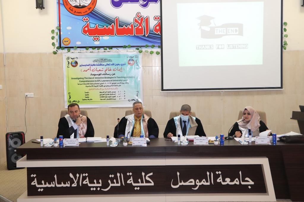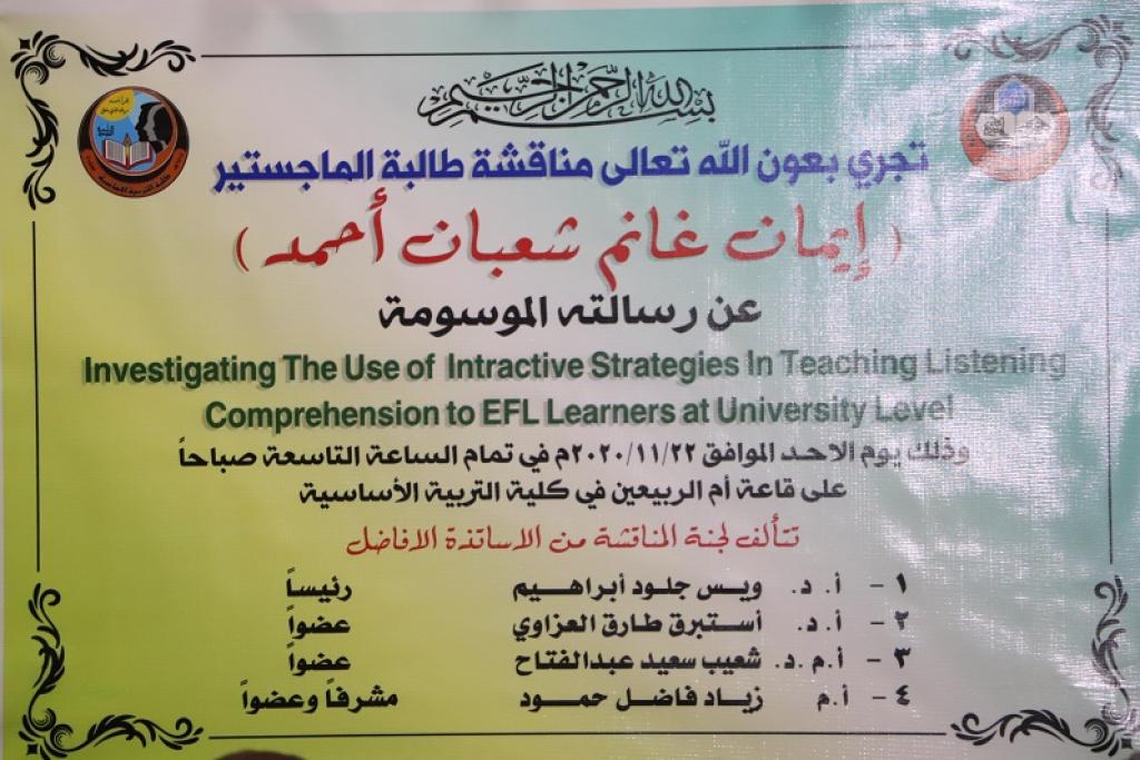 ناقش قسم اللغة الانكليزية في كلية التربية الاساسية بجامعة الموصل رسالة الماجستير الموسومة ( استقصاء استخدام الاستراتيجيات التفاعلية في تدريس الاصغاء الاستيعابي لمتعلمي اللغة الإنكليزية كلغة أجنبية في المرحلة الجامعية ) للطالبة ايمان غانم شعبان من قسم اللغة الانكليزية صباح يوم الاحد الموافق 22 تشرين الثاني 2020 وعلى قاعة الحدباء في الكلية ، حضر جانبا منها السيد معاون العميد للشؤون العلمية الأستاذ الدكتور محمد توفيق عثمان آل حسين ، وترأس لجنة المناقشة أ.د. ويس جلود ابراهيم وعضوية أ.د. استبرق طارق العزاوي و ا.م.د. شعيب سعيد عبد الفتاح و ا.م. زياد فاضل حمود عضواً ومشرفاً .تناولت الرسالة الإصغاء الاستيعابي هو مهارة فعالة لأنه يستوجب التفاعل مع النص المنطوق. ويعتبر أيضا مهارة صعبة التدريس والبحث لأنه يتم معالجته بطريقة غير مرئية داخل عقل المستمع. إن من المشاكل الرئسية التي تواجه متعلمي اللغة الإنكليزية كلغة أجنبية فيما يخص الإصغاء الإستيعابي هي تلك التي تتعلق بالاستراتيجيات المستخدمة⸲ وأخرى تتعلق بالغرض من عملية الاصغاء بالإضافة الى مشاكل تتعلق بالحالة العاطفية للمتعلمين. لذلك وضِعت خمس فرضيات صفرية لتقصي إستخدام إستراتيجية الصور المتتالية وإستراتيجية الفيديو في تدريس الإصغاء الإستيعابي وتأثيرهما على كفاءة الإصغاء الإستيعابي للطلاب. وهدفت الرسالة الى :إستكشاف أي الاستراتيجيتين (إستراتيجية الصور المتتالية ام إستراتيجية الفيديو) اكثر فاعلية على كفاءة الإصغاء الإستيعابي للطلاب. إستكشاف علاقة القلق بكفاءة الإصغاء الإستيعابي للطلاب بإستخدام إستراتيجية الصور المتتالية.إستكشاف علاقة القلق بكفاءة الإصغاء الإستيعابي للطلاب بإستخدام إستراتيجية الفيديو. اختيرت العينات في هذا البحث الكمي بشكل عشوائي⸲ حيث تم اختيار خمسين طالباً وتم تقسيمهم الى مجموعتين. والمشاركون هم من طلاب المرحلة الثالثة بقسم اللغة الإنكليزية في كلية التربية الأساسية في جامعة الموصل. وفيما يتعلق بالمحتوى المدَرس، فقد اختارت الباحثة (8) فيديوهات من وثائقيات ال بي بي سي كمادة لتدريس الإصغاء الإستيعابي. استغرق كل فيديو حوالي (5-7) دقيقة. وقد قامت الباحثة بالتعديل على نفس الفيديوهات لتُناسب إستخدام إستراتيجية الصور المتتالية للمجموعة الأخرى. استُخدِم إختبار – من نوع الاختيار من متعدد- وإستبيان – من نوع ليكرت- لجمع البيانات. إضافة الى ذلك، استُخدِم الإختبار التائي ومعامل إرتباط بيرسون في إستخلاص النتائج. وبالتالي، أهم النتائج هي:إستراتيجية الصور المتتالية واستراتيجية الفيديو فعَالتان في تدريس الإصغاء الإستيعابي.إستراتيجية الفيديو اكثر فاعلية من إستراتيجية الصور المتتالية في تدريس الإصغاء الإستيعابي.توجد علاقة إيجابية بين قلق الإصغاء للطلاب الذين درِّسوا بإستخدام إستراتيجية الصور المتتالية وكفاءة إصغائهم الإستيعابي. توجد علاقة إيجابية بين قلق الإصغاء للطلاب الذين درِّسوا بإستخدام إستراتيجية الفيديو وكفاءة إصغائهم الإستيعابي .