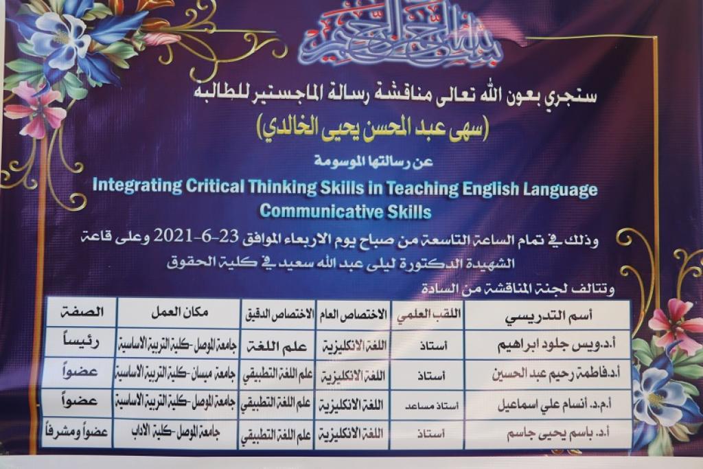 ناقش قسم اللغة الانكليزية في كلية التربية الاساسية بجامعة الموصل رسالة الماجستير الموسومة ( دمج مهارات التفكير النقدي في تعليم المهارات التواصلية للغة الإنكليزية ) للطالبة سهى (عبد المحسن يحيى الخالدي ) من قسم اللغة الانكليزية صباح يوم الاربعاء الموافق 23حزيران 2021 وعلى قاعة الشهيدة الدكتورة ليلى عبد الله سعيد في كلية الحقوق ، حضر جانبا منها السيد عميد الكلية الأستاذ المساعد الدكتور صفاء الدين عبد الله سليمان ومعاوني عميد الكلية العلمي والإداري الأستاذ الدكتور محمد توفيق عثمان والأستاذ المساعد الدكتور محمد يونس صالح الجريسي ، وترأس لجنة المناقشة أ.د.ويس جلود ابراهيم وعضوية أ.د. فاطمة رحيم عبد الحسين / و أ.م.د. انسام علي إسماعيل و أ.د. باسم يحيى جاسم عضواً ومشرفاً .
