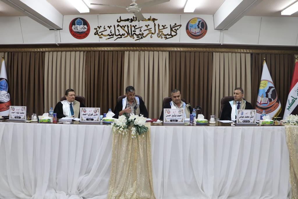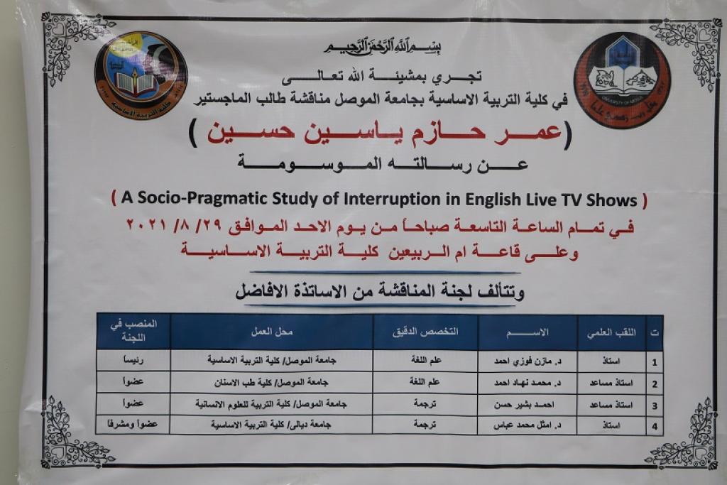 ناقش قسم اللغة الانكليزية في كلية التربية الاساسية بجامعة الموصل رسالة الماجستير الموسومة ( دراسة اجتماعية براغاماتية للانقطاع في البرامج التلفزيونية الإنكليزية الحية ) للطالب عمر حازم ياسين حسين من قسم اللغة الانكليزية صباح يوم الاحد الموافق 29 اب 2021 وعلى قاعة ام الربيعين ، حضر جانبا منها السيد عميد كلية التربية الأساسية الأستاذ الدكتور صفاء الدين عبد الله سليمان ومعاوني العميد العلمي والإداري الأستاذ الدكتور محمد توفيق عثمان والأستاذ المساعد الدكتور محمد يونس صالح الجريسي ، . وترأس لجنة المناقشة أ.د. مازن فوزي احمد وعضوية أ.م.د. محمد نهاد احمد / و ا.م. احمد بشير حسن و أ.د. امثل محمد عباس عضواً ومشرفاً .