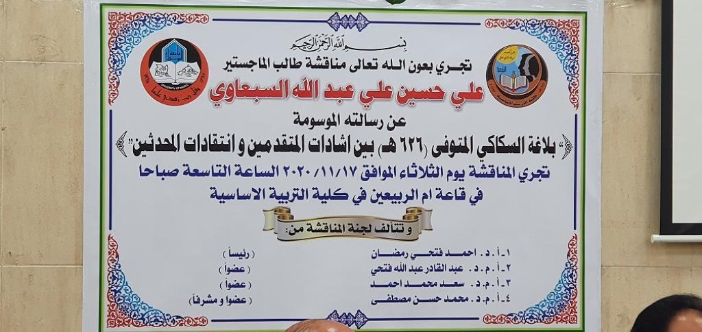 ناقش قسم اللغة العربية في كلية التربية الاساسية بجامعة الموصل رسالة الماجستير الموسومة ( بلاغة السكاكي المتوفي ( 626 هـ ) بين اشادات المتقدمين وانتقادات المحدثين) ، صباح يوم الثلاثاء الموافق 17 تشرين الثاني 2020 وعلى قاعة الحدباءفي الكلية ، حضر جانبا منها السيد عميد كلية التربية الأساسية الأستاذ المساعد الدكتور صفاء الدين عبد الله سليمان ومعاونيه العلمي والإداري الأستاذ الدكتور محمد توفيق عثمان آل حسين والدكتور محمد يونس صالح ، وترأس لجنة المناقشة أ.د. احمد فتحي رمضان وعضوية أ.م.د. عبد القادر عبد الله فتحي و أ.م.د. سعد محمد احمد و ا.م.د. محمد حسن مصطفى عضواً ومشرفاً .