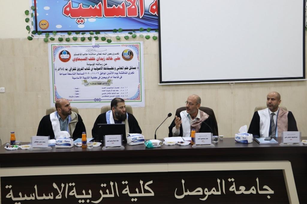 ناقش قسم اللغة العربية في كلية التربية الاساسية بجامعة الموصل رسالة الماجستير الموسومة ( مسائل علم المعاني وتطبيقاتها الأصولية في كتاب الفروق للقرافي ( ت 684 هـ )) ، صباح يوم الاثنين الموافق 16 تشرين الثاني 2020 وعلى قاعة ام الربيعين ، حضر جانبا منها السيد عميد كلية التربية الأساسية الأستاذ المساعد الدكتور صفاء الدين عبد الله سليمان ومعاونيه العلمي والإداري الأستاذ الدكتور محمد توفيق عثمان آل حسين والدكتور محمد يونس صالح ، وترأس لجنة المناقشة أ.م.د. عمار إسماعيل احمد وعضوية أ.م.د. سعد عبد الرحيم احمد و أ.م.د. عبد الموجود عثمان علي و ا.م.د. محمد حسن مصطفى عضواً ومشرفاً .تناولت الرسالة دراسة ان النظر العلوم والمعارف الإسلامية يتيه نظراً، ويعلو فخراً بخضم رائق من جمال صنعتها، وإتقان بنائها، وروعة مباحثها، ومن أجلّ تلك العلوم علم أصول الفقه الذي تشكل دلالات الألفاظ غالب مباحثه، فلا يخفى على أحد التداخل بين علم أصول الفقه وعلم المعاني؛ إذ يعد علم أصول الفقه الجانب التطبيقي لعلم المعاني ، ومن بين كتب الأصول الحافلة بمسائل علم المعاني كتاب الفروق للقرافي( ت:684ه) ، فبعد أن عرضت على أستاذي الفاضل المشرف أن تكون دراستنا لعلم المعاني، وأن يكون حقلها كتب أصول الفقه؛ لِمَا تحتويه من علوم وافرة، وافقني الرأي وعرض عليّ أن تتجه دراستنا إلى الجمع بين الجانب النظري في علم المعاني والجانب التطبيقي لمسائله في أحد أهم كتب الأصول، واخترنا كتاب الفروق للقرافي،كان الهدف من الدراسة في إبراز مسائل علم المعاني من كتاب الفروق، وبيان جوانبها التطبيقية؛ لأنّ البلاغة تعين على فهم كلام العرب، ومصادر التشريع من قرآن كريم وسنّة مطهرة إنّما أتيا باللسان العربي .وكان منهجنا في الدراسة يتعلق بجانبين: عرض المادة وتخريجها من الكتاب، ثمّ تحليلها وفق الأغراض البلاغية، ودلالتها في التركيب الذي ترد فيه، وأثر هذه الدلالة في بناء القواعد الأصولية، وبعد ذلك نبدأ بالتعريف بالباب في اللغة واصطلاح البلاغيين والأصوليين، وإذا وجدتُ تعريفاً أو احترازاً أو قيداً للقرافي ذكرته ؛ لأنّ الأصوليين دققوا النظر في كلام العرب، فكانوا أحوط في التحقيق والتدقيق لجزئيات المسائل، وبعد الفراغ من التعريفات، أذكر صيغ كلّ باب وأُتبعه ببيان المعاني الأصلية، والمعاني التي يخرج إليها مع التمثيل لكلّ معنى من القرآن قدر الإمكان، ومن النصوص التي تناولها القرافي على وجه الخصوص، ثمّ أذكر التقسيمات إن كان في الباب تقسيمات، وبعد ذلك نأخذ ببيان التطبيقات الأصولية لمسائل علم المعاني الواردة في كتاب الفروق . أمّا في ما يتعلق بالإحالة إلى المصادر: فأبدأ بذكر اسم الكتاب ثم المؤلف والمعلومات حول المصدر كاملة عند وروده لأول مرة، وإذا تكرر المصدر فأكتفي بذكر اسم الكتاب والجزء والصفحة، وفي حال اشتراك أكثر من كتاب بالعنوان نفسه أذكر اسم مؤلفه للتفريق بينهما .وكان من أهم المصادر والمراجع التي أفاد منها البحث، كتاب الفروق نفسه، وكتب التفسير كأضواء البيان للشنقيطي، وروح المعاني للألوسي، وكتب اللغة، ككتاب العين، والمقاييس، وتهذيب اللغة، ولسان العرب، وكتب أصول الفقه، كالبحر المحيط للزركشي، والبرهان للإمام الجويني، والعدة للقاضي أبي يعلى، والذخيرة للقرافي نفسه، وكتب البلاغة، كدلائل الإعجاز، والمفتاح، وشروحه، وتلخيصه .