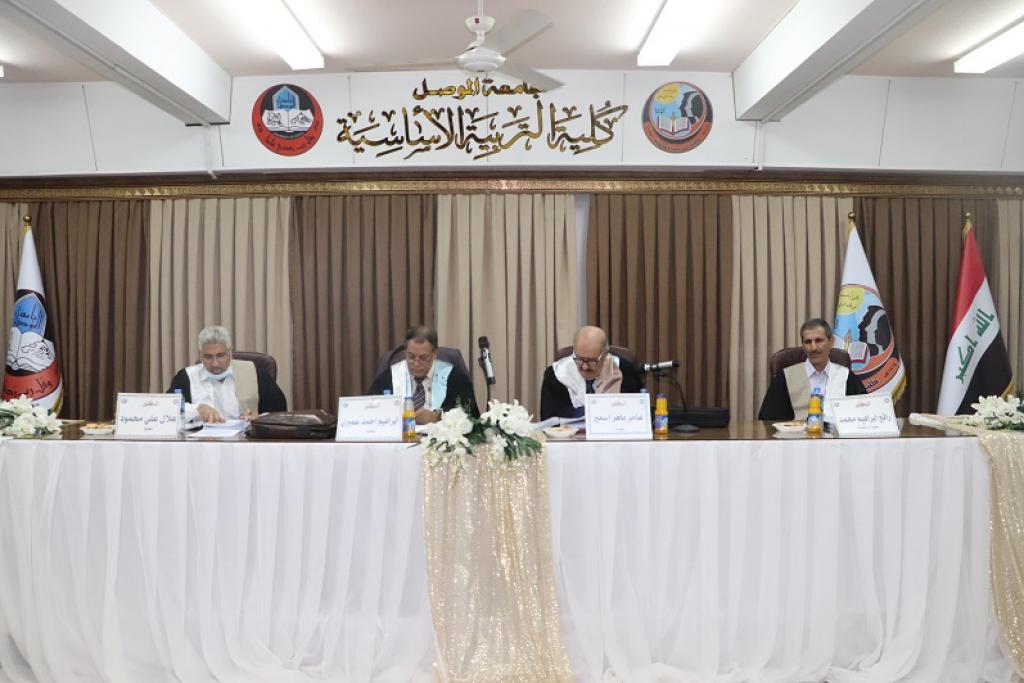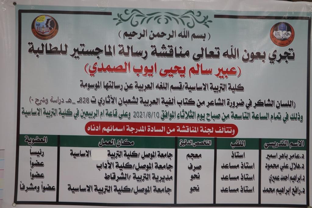 ناقش قسم اللغة العربية في كلية التربية الاساسية بجامعة الموصل رسالة الماجستير الموسومة ( اللسان الشاكر في ضرورة الشاعر من كتاب الفية العربية لشعبان الآثاري ت 828هـ دراسة وشرح ) للطالبة عبير سالم يحيى الصمدي من قسم اللغة العربية صباح يوم الثلاثاء الموافق 10 تموز 2021 وعلى قاعة ام الربيعين ، حضر جانبا منها السيد عميد الكلية الأستاذ المساعد الدكتور صفاء الدين عبد الله سليمان ومعاوني عميد الكلية العلمي والإداري الأستاذ الدكتور محمد توفيق عثمان والأستاذ المساعد الدكتور محمد يونس صالح الجريسي ، . وترأس لجنة المناقشة أ.د. عامر باهر اسمير وعضوية أ.م.د. هلال علي محمود / و أ.م.د. إبراهيم احمد عميري و أ.م. د. رافع إبراهيم محمد عضواً ومشرفاً .