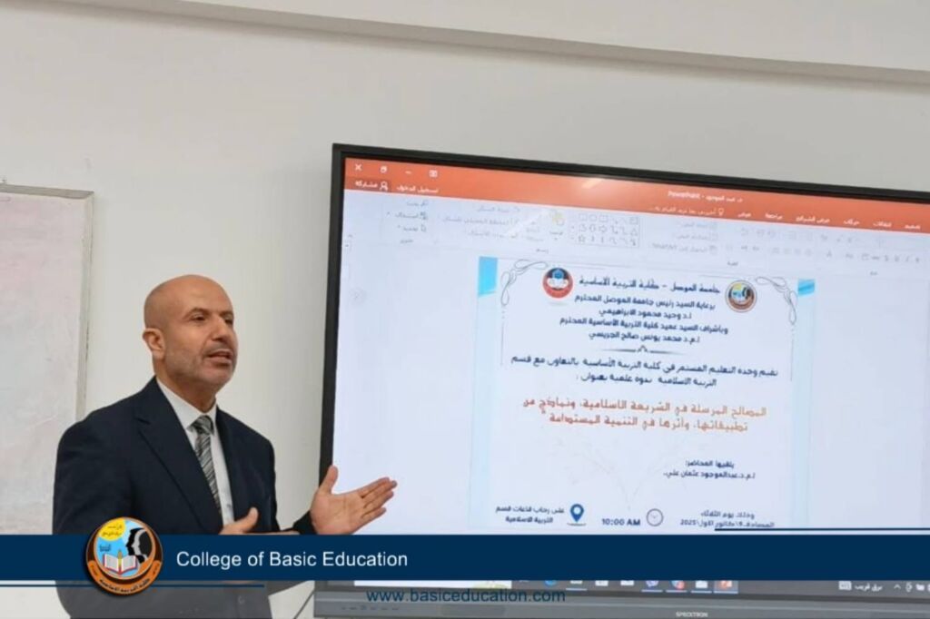 كلية التربية الأساسية تقيم ( ندوة علمية ) بعنوان : " المصالح المرسلة في الشريعة الإسلامية ، ونماذج من تطبيقاتها ، واثرها في التنمية المستدامة "