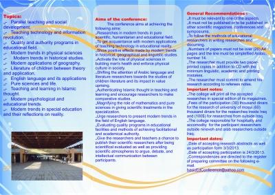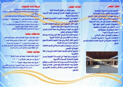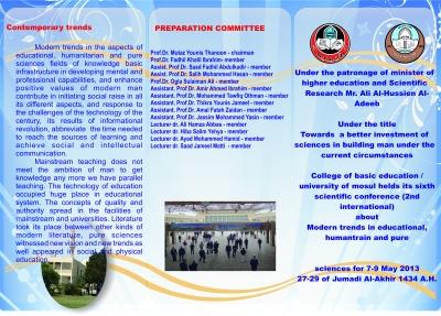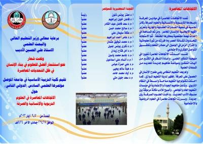 ستقيم كلية التربية الاساسية مؤتمرها العلمي السادس الدولي الثاني حول (الاتجاهات المعاصرة في العلوم التربوية والانسانية والصرفة ) وتحت شعار ( نحو استثمار افضل للعلوم في بناء الانسان في ظل التحديات المعاصرة ) وذلك للمدة من 7- 9 ايار 2013م الموافق 27 – 29 جمادي الاخر 1434هـملاحظة مهمة جداتم تمديد موعد استلام ملخصات البحوث للمشاركة في المؤتمر لغاية يوم الاحد الموافق 3/3/2013سيكون اخر موعد لاستلام بحوث المؤتمر العلمي السادس الدولي الثاني لكلية التربية الاساسية هو يوم الخميس الموافق 18/4/2013 وسوف لن يتم استلام اي بحث بعد التاريخ المذكور آنفا .وسيكون التسجيل على عنوان البريد الالكتروني التالي[email protected]والاشتراك عبر الاستمارة التالية بالعربيةاضغط هناوالاشتراك عبر الاستمارة التالية بالانكليزيةاضغط هناويمكنكم الاطلاع على تفاصيل المؤتمر من الدوار التالي باللغة العربية واللغة الانكليزية :– للاطلاع على تفاصيل الدوار كاملة باللغة العربية وبصيغة PDF اضغط هنا– للاطلاع على تفاصيل الدوار كاملة باللغة الانكليزية وبصيغة PDF اضغط هنا