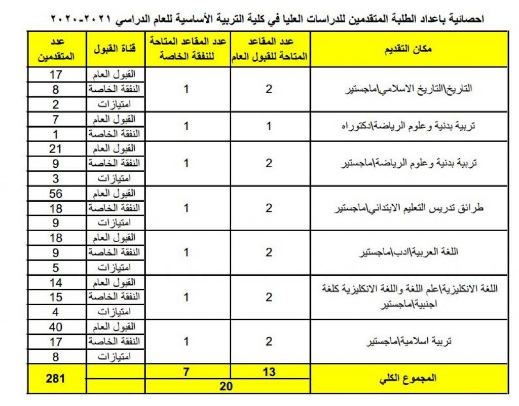 عمادة كلية التربية الأساسية تنظم إحصائية بأعداد الطلبة المتقدمين للدراسات العليا في الكلية