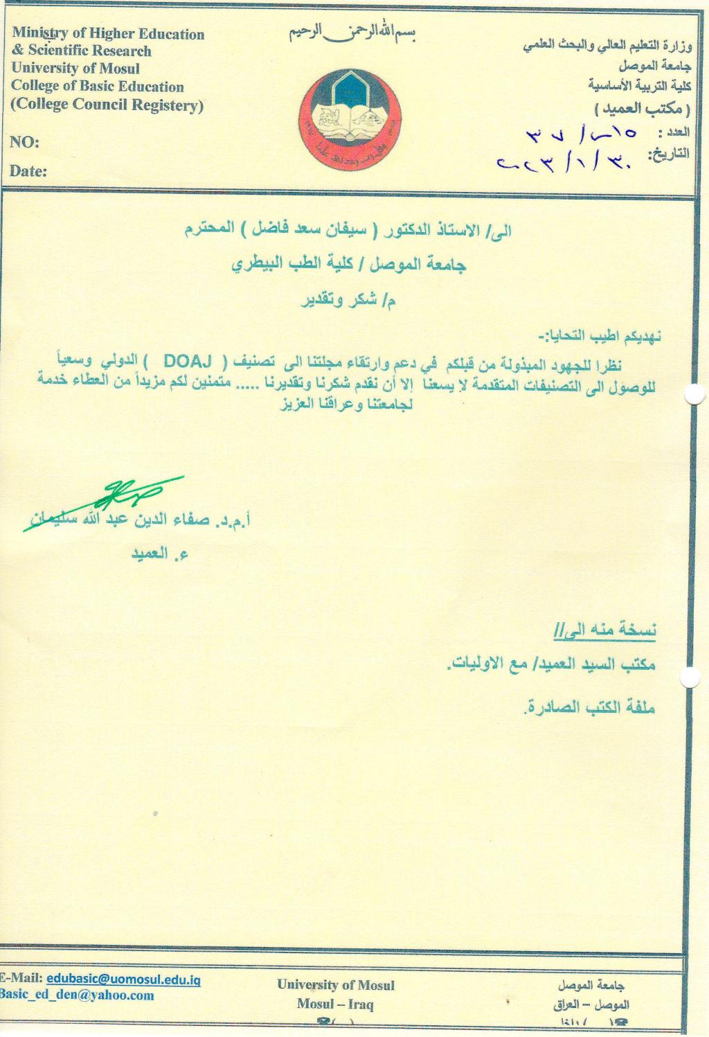 أهدت عمادة كلية التربية الأساسية في جامعة الموصل كتاب شكر وتقديرالى الأستاذ الدكتور(زكريا يحيى الجمال) مدير الشؤون العلمية في رئاسة الجــــــامعةوالأســـتاذ الدكتور (سيفان سعد فاضل) التدريسي في كلية الطب البيطري / جامعة الموصلوذلك لجهودهم المبذولة لارتقاء مجلة أبحاث كلية التربية الأساسية الى تصنيف ( DOAJ )متمنين لهم مزيداً من العطاء لجامعتنا وعراقنا العزيز .