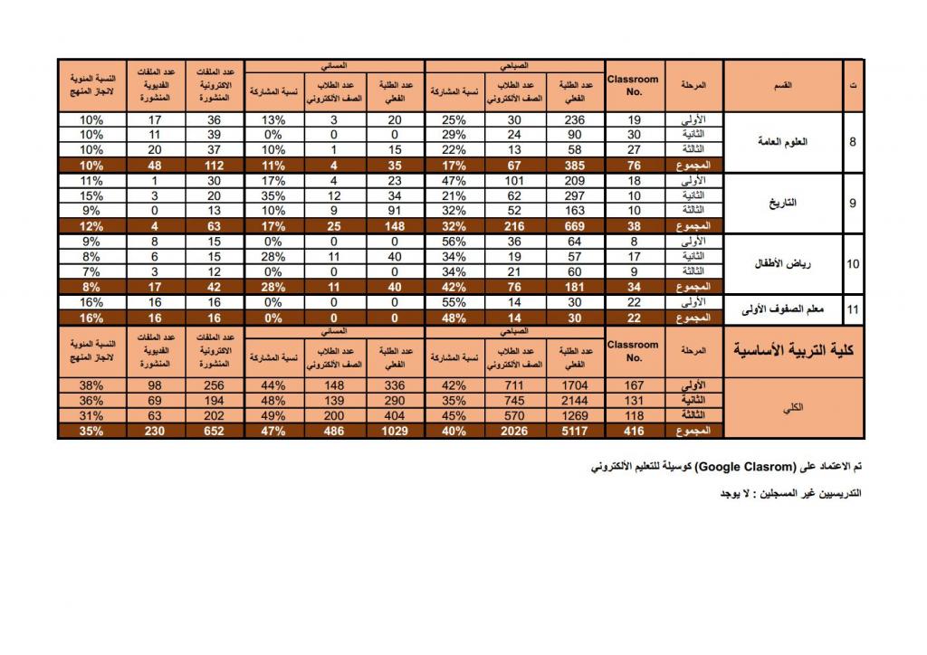 عمادة كلية التربية الاساسية تعد احصائية تفصيلية حول استخدام التعليم الإلكتروني لأقسامها العلمية