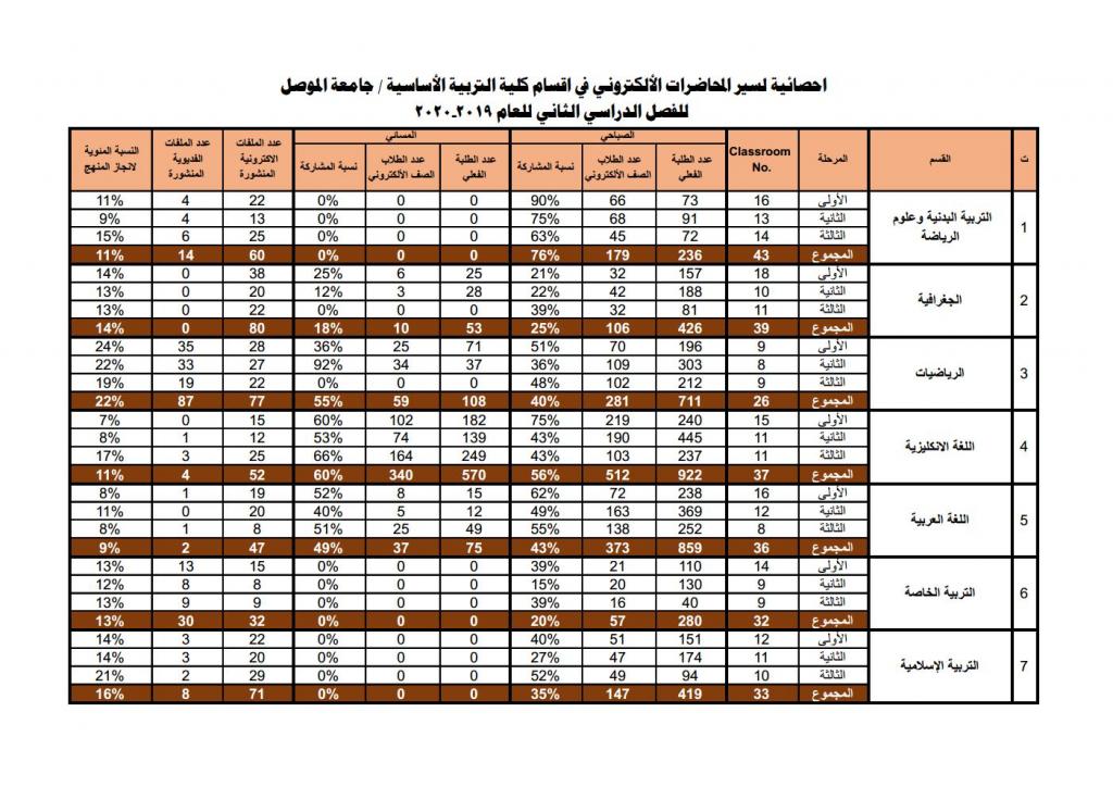 حسب توجيهات السيد رئيس الجامعة قصي كمال الدين الأحمدي والسيد عميد الكلية الدكتور صالح محمد حسن .. وباشراف الدكتور محمد توفيق آل حسين أغا معاون العميد للشؤون العلمية وبالتعاون مع السادة رؤساء الأقسام ، تم اعداد احصائية تفصيلية لغرض الوقوف على المستوى الذي وصل اليه التعليم الألكتروني في الكلية . وهذه الإحصائية تمثل معيارا لجهود الكلية وتدريسها في متابعة الاوامر الصادرة من الوزارة ومن رئاسة جامعة الموصل … فالمتأمل لعدد الكلاسات (416) صفا الكترونيا وبنسبة حضور (بين 40-45 %) ونسبة انجاز للمنهج التعليمي يصل الى (35%) خلال الاسابيع الثلاثة المنصرمة وعلى الرغم من امتناع بعض الطلبة.. فإن هذا يعد انجازا رائعا .. يجب ان تفتخر به كلية التربية الاساسية ومنتسبيها …. وفق الله الجميع لخدمة العلمية التعليمة في وطننا الغالي . وخدمة لأبنائنا الطلبة ..