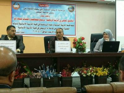 برعاية الاستاذ الدكتور أبي سعيد الديوه جي رئيس جامعة الموصل وبحضور الدكتور صالح محمد حسن عميد كلية التربية الاساسية ومعاوني العميد العلمي والاداري الاستاذ الدكتور محمد توفيق عثمان والدكتور محمد يونس صالح والاستاذ المساعد نشوان الصفار مسؤول وحدة التعليم المستمر ورئيس وأعضاء قسم التربية البدنية وعلوم الرياضة واساتذة وموظفي وطلاب الكلية ، وتحت شعار ( الرياضة المدرسية رافد لجميع الالعاب ) أقامت كلية التربية الاساسية ممثلة بوحدة التعليم المستمر / قسم التربية البدنية وعلوم الرياضة ندوتها العلمية بعنوان ( التطبيق العملي في التربية الرياضية ترسيخ للمفاهيم واكتساب للمهارات )وذلك في تمام الساعة العاشرة من يوم الاربعاء الموافق 22ايار 2018 وعلى قاعة ام الربيعين ، بدأت بتلاوة للذكر الحكيم بعدها بدأت الجلسة الاولى برئاسة الاستاذ الدكتور عكلة سليمان الحوري بعدها تم تكريم الاساتذة الاكفاء منهم الدكتور معيوف ذنون حنتوش والمرحوم الدكتور معتز يونس ذنون درع الكلية وعلى جميع المشاركين في المؤتمر .
