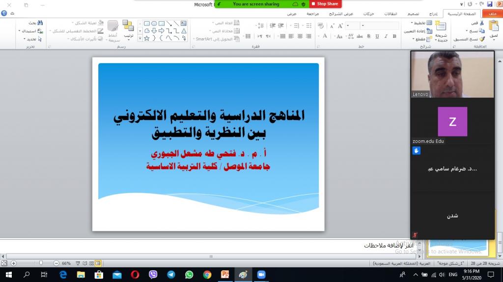 عقد قسم التربية الخاصة في كلية التربية الأساسية جامعة الموصل بالتعاون مع قسم العلوم التربوية والنفسية في كلية التربية جامعة القادسية يوم الأحد الموافق ٣١/ ٥ / ٢٠٢٠ الساعة الثامنة والنصف مساء وعلى برنامج Zoom وعبر الفضاء الالكتروني ورشة عمل تحت عنوان ((المناهج الدراسية والتعليم الالكتروني بين النظرية والتطبيق)) قدمها أ.م.د. فتحي طه مشعل الجبوري رئيس قسم التربية الخاصة في كلية التربية الأساسية جامعة الموصل . وكان الهدف من الورشة التعرف على كيفية تصميم المناهج الدراسية الكترونيا والفرق بين تطبيقه نظرياً وعملياً .