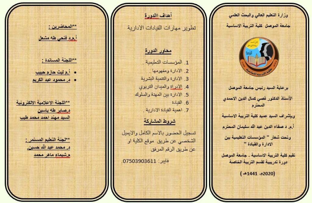 موعدكم اليوم في الساعة الثامنة مساءً مع الدورة التدريبية التي يقيمها قسم التربية الخاصة في كلية التربية الأساسية تحت عنوان ( المؤسسات التعليمية بين الادارة والقيادة ) والتي تستمر يومي الاحد والاثنين الموافق 4 – 5 / 10/2020 ، والتي يحاضر فيها الأستاذ المساعد الدكتور فتحي طه مشعل الجبوري رئيس قسم التربية الخاصة وعبر الرابط الالكتروني لمنصة ( Meet ) الافتراضية .https://meet.google.com/qvh-smfd-zoi