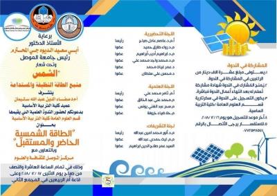 برعاية الأستاذ الدكتور أبي سعيد الديوه جي المحترم رئيس جامعة الموصل وتحت شعار "الشمس منبع الطاقة النظيفة والمستدامة" يتشرف أ.م.د. صفاء الدين عبد الله سليمان عميد كلية التربية الأساسية بدعوتكم لحضور الندوة العلمية التي يقيمها قسم العلوم العامة في كلية التربية الأساسية بعنوان "الطاقة الشمسية الحاضر والمستقبل" بالتعاون مع مركز الموصل للثقافة والعلوم وذلك في تمام الساعة العاشرة والنصف من صباح يوم 17/12/2018 وفي قاعة أم الربيعين في المجمع الثاني .للاستفسار يرجى الأتصال بالدكتور عمر غياث على الرقم 07725385411 .