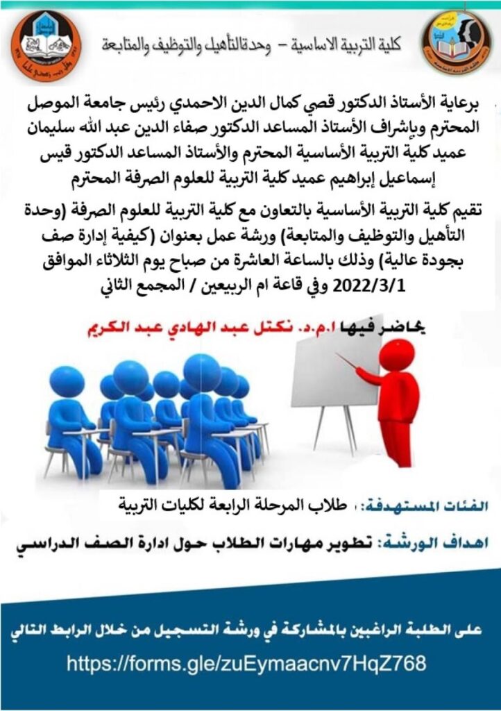 برعاية الأستاذ الدكتور قصي كمال الدين الاحمدي رئيس جامعة الموصل المحترم وبإشراف الأستاذ المساعد الدكتور صفاء الدين عبد الله سليمان عميد كلية التربية الأساسية المحترم أقامت كلية التربية الأساسية بالتعاون مع كلية التربية للعلوم الصرفة ( وحدة التأهيل والتوظيف والمتابعة ) ورشة عمل بعنوان (كيفية إدارة صف بجودة عالية ) وذلك بالساعة العاشرة من صباح يوم الثلاثاء الموافق 1/3/2022 وفي قاعة ام الربيعين / المجمع الثاني حاضر فيها ا.م.د. نكتل عبد الهادي عبد الكريم ، حيث تم افتتاح الورشة من قبل م.م. شيماء ماهر محمد مسؤولة وحدة التعليم المستمر و م.م. ليث حمدي عبد الله مسؤول وحدة التأهيل والتوظيف والمتابعة كلية التربية الأساسية و م.د. هناء فتحي محمود مسؤولة وحدة التأهيل والتوظيف والمتابعة كلية التربية للعلوم الصرفة ، تناولت الورشة أنواع الانماط الإدارية لمعلمي الصف مثل النمط الفوضوي والنمط التسلطي والنمط الحازم والنمط الديمقراطي والنمط العاطفي والفرق بين ادارة الصف وضبط الصف مع عرض فديوات توضيحية حول التعليم الإيجابي والتعليم السلبي . وحضر الورشة عدد كبير من طلبة الدراسات العليا والاولية من كلية التربية الأساسية وباقي كليات الجامعة .