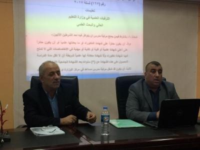 بحضور السيد معاون العميد للشؤون العلمية الاستاذ الدكتور محمد توفيق عثمان والسيد معاون العميد للشؤون الإدارية الدكتور محمد يونس الجريسي أقامت لجنة الترقيات العلمية في كلية التربية الأساسية ورشة عمل هدفت إلى توضيح التعليمات الجديدة للترقيات العلمية وحضر الورشة السادة رئيس واعضاء اللجنة الرئيسية في الكلية و رؤساء وأعضاء اللجان العلمية في الأقسام العلمية في الكلية.