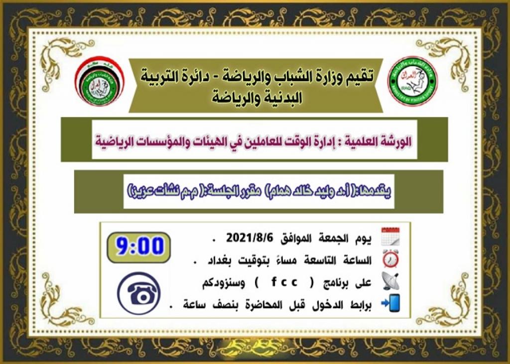 شارك أ.د. وليد خالد همام رئيس تحرير مجلة كلية التربية الأساسية والتدريسي في قسم التربية البدنية وعلوم الرياضة في الكلية في الورشة العلمية الالكترونية التي أقامتها وزارة الشباب والرياضة – دائرة التربية البدنية والرياضة تحت عنوان ( إدارة الوقت للعاملين في الهيئات والمؤسسات الرياضية ) وذلك بالساعة التاسعة من مساء يوم الجمعة الموافق 6/8/2021 .