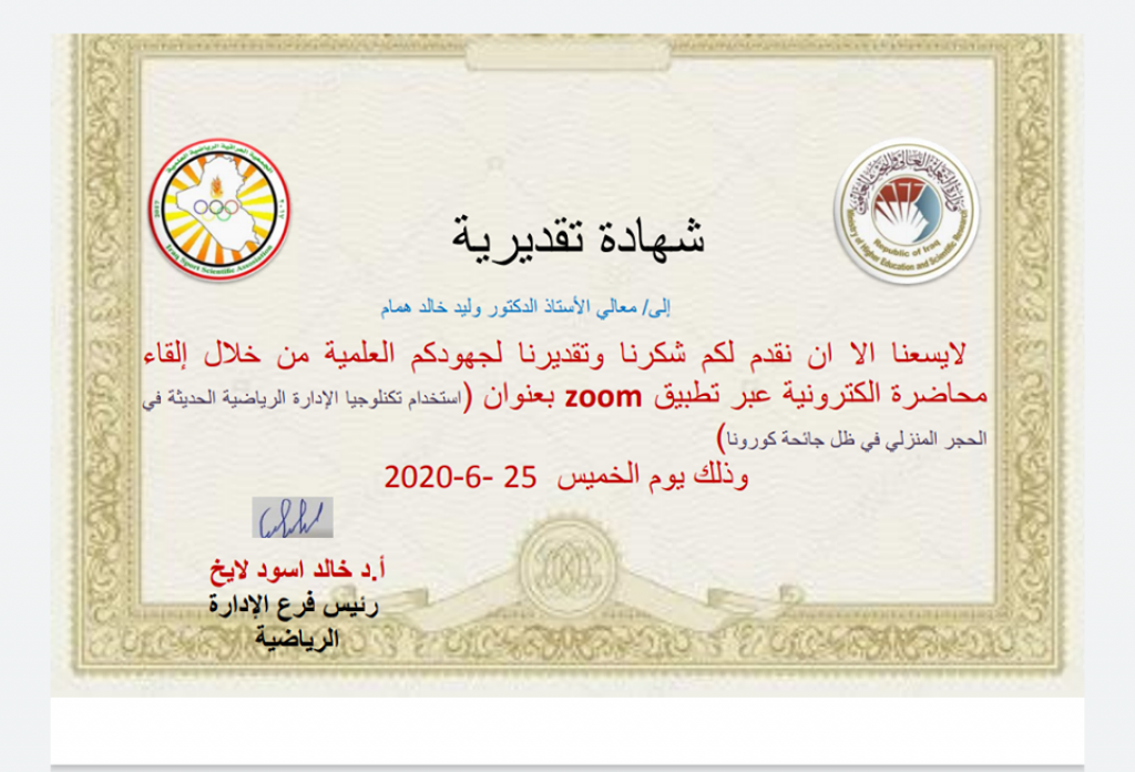 شارك الاستاذ الدكتور وليد خالد همام من قسم التربية البدنية وعلوم الرياضة / كلية التربية الاساسية في ورشة عمل أقامتها الجمعية العراقية العلمية الرياضية فرع الادارة الرياضية وتم تقديم محاضرة من قبل الدكتور وليد خالد عن استخدام تكنلوجيا الادارة الرياضية الحديثة في ضل جائحة كورونا….