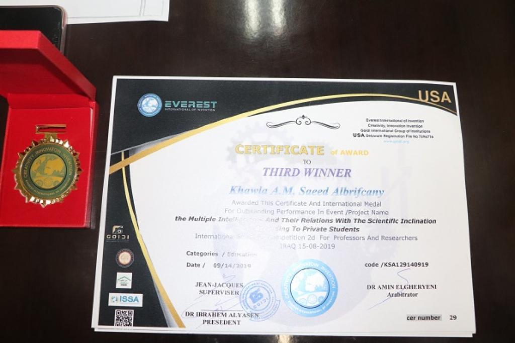 شاركت ا.م. خولة احمد محمد سعيد من قسم التربية الخاصة في كلية التربية الاساسية في مسابقة البحوث المنشورة والتي نظمتها منظمة ايفرست الفرنسية وحصلت الباحثة على المرتبة الثالثة في العالم عن بحثها الموسوم ( الذكاءات المتعددة وعلاقتها بالميول العلمية لدى الطالبات المتميزات ) بتاريخ 15/8/2019 .