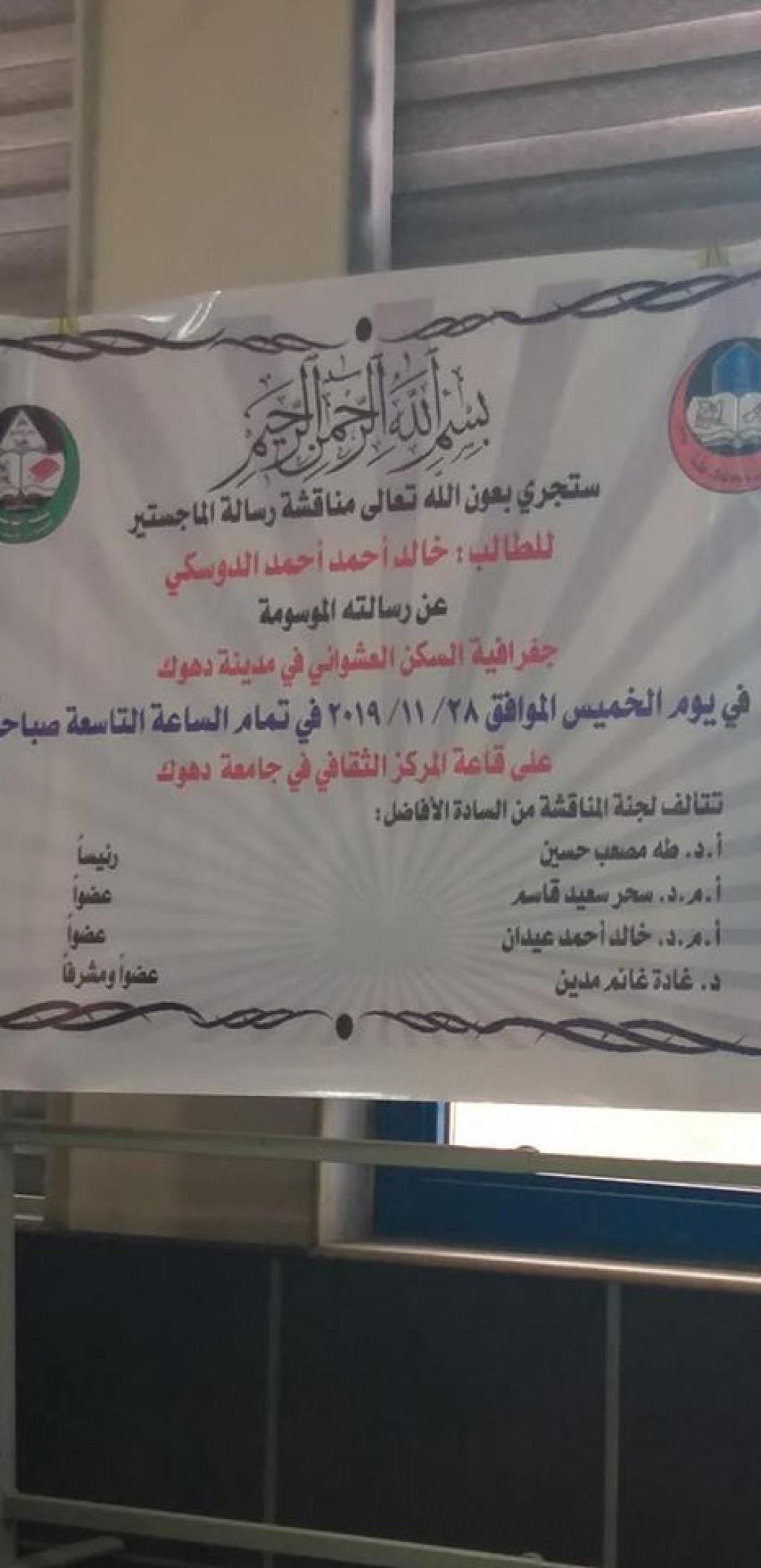 مشاركة أ.م.د. خالد احمد عيدان من كلية التربية الاساسية في لجنة مناقشة رسالة ماجستير في جامعة دهوك
