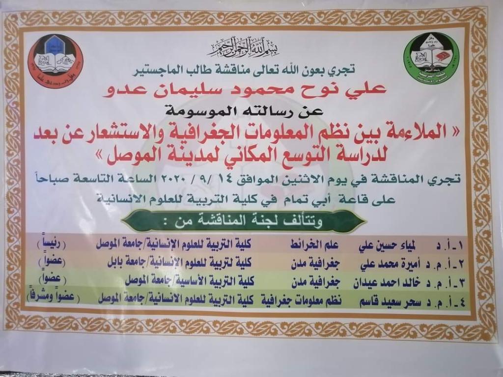 شارك الاستاذ المساعد الدكتور خالد احمد عيدان الحديدي رئيس قسم الجغرافية في كلية التربية الاساسية في لجنة مناقشة رسالة ماجستير في جامعة الموصل كلية التربية للعلوم الانسانية يوم الاثنين الموافق 14/9/2020 للطالب علي نوح محمود عن رسالته الموسومة (الملاءمة بين نظم المعلومات الجغرافية والاستشعار عن بعد لدراسة التوسع المكاني لمدينة الموصل ) وعلى أروقة قاعة ابي تمام في الكلية التربية للعلوم الإنسانية وتألفت لجنة المناقشة من :أ.د لمياء حسين علي . رئيساًأ.م.د اميرة محمد علي .عضواًأ.م.د خالد احمد عيدان . عضواًأ.م.د سحر سعيد قاسم . عضواً ومشرفاهدفت الدراسة الى دراسة تطور الحجم السكاني وقياس حجم التوسع المكاني وتحليله مما شهدته مدينة الموصل للفترة (2017- 1977)، ولتحقيق ذلك اعتمدت الدراسة على تقنيتي نظم المعلومات الجغرافية والاستشعار عن بعد .