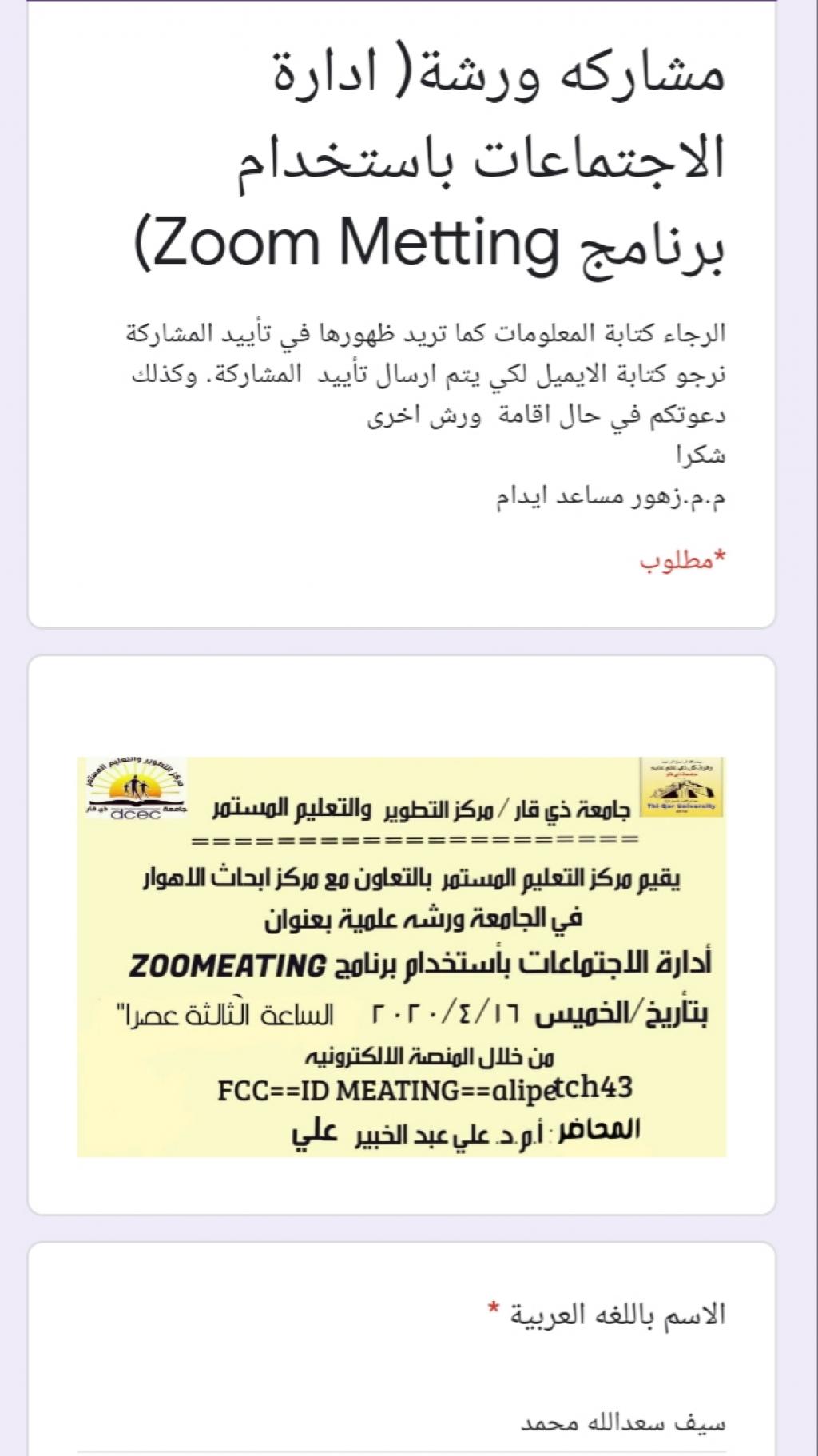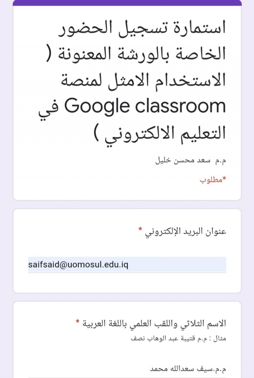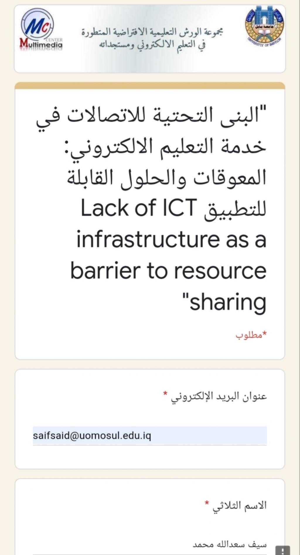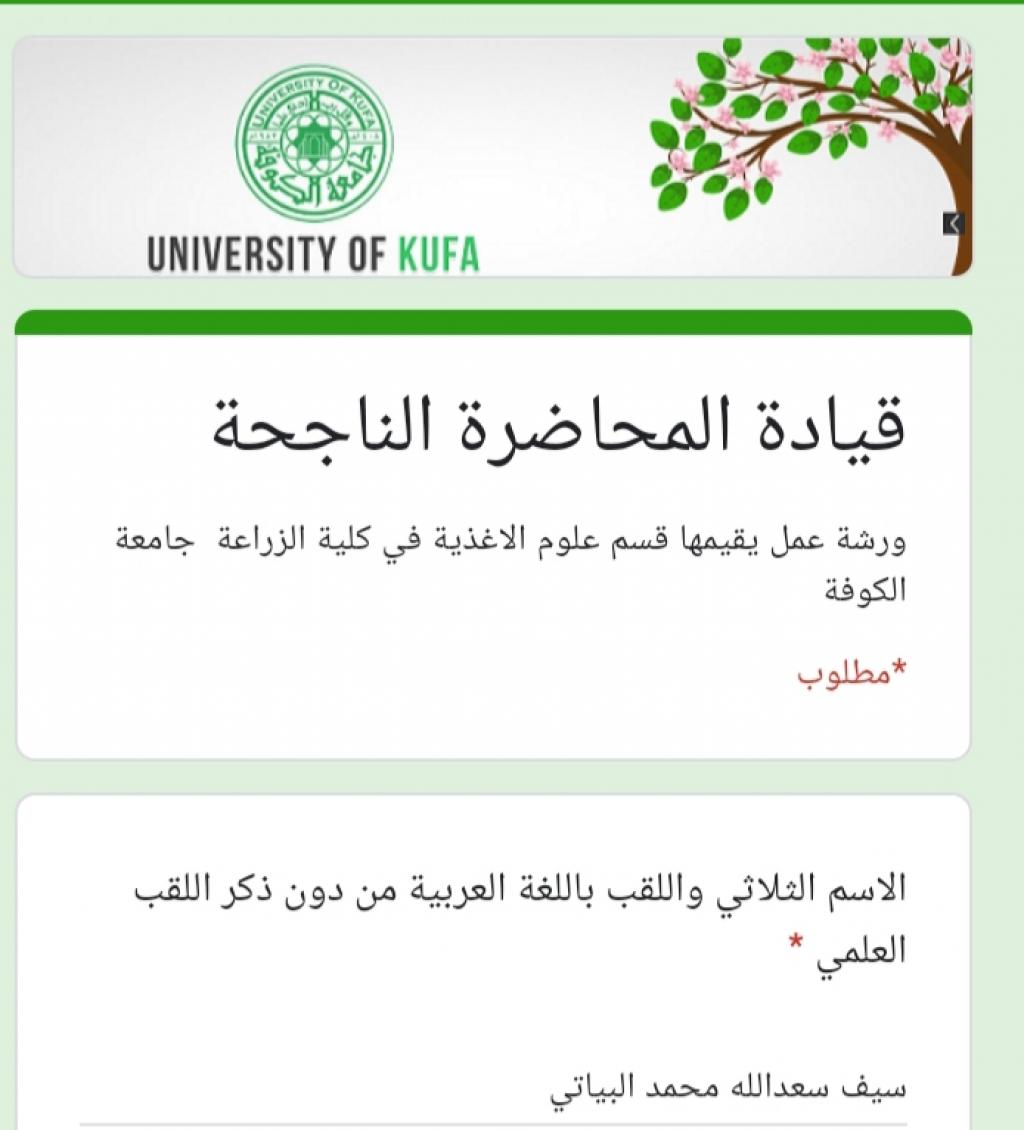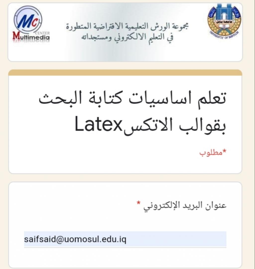 شارك التدريسي سيف سعدالله محمد من قسم اللغة العربية في كلية التربية الاساسية في ورش جامعات الكوفة وذي قار وبابل والجامعة التقنية الوسطى في مجال تفعيل الحضور الافتراضي على الشبكة العنكبوتية والتواصل العلمي التدريبي الآتية١/ ورشة (قيادة المحاضرة الناجحة)أقامتها جامعة الكوفة /قسم علوم الأغذية في ٤/١٦٢/ورشة(تعليم أساسيات كتابة البحث بقوالب Latex) أقامتها جامعة بابل في ٤/١٦.٣/ورشة (إدارة الاجتماعات باستخدام برنامج zoom meeting)أقامتها جامعة ذي قار /مركز التعليم المستمر في ٤/١٦.٤/ورشة(البنية التحتية للاتصالات في خدمة التعليم الإلكتروني)أقامتها جامعة بابل في ٤/١٦٥/ورشة(الاستخدام الأمثل لمنصة Google Class Room في التعليم الإلكترونيأقامتها الجامعة التقنية الوسطى/ المعهد التقني في بعقوبة بتأريخ٤/١٦