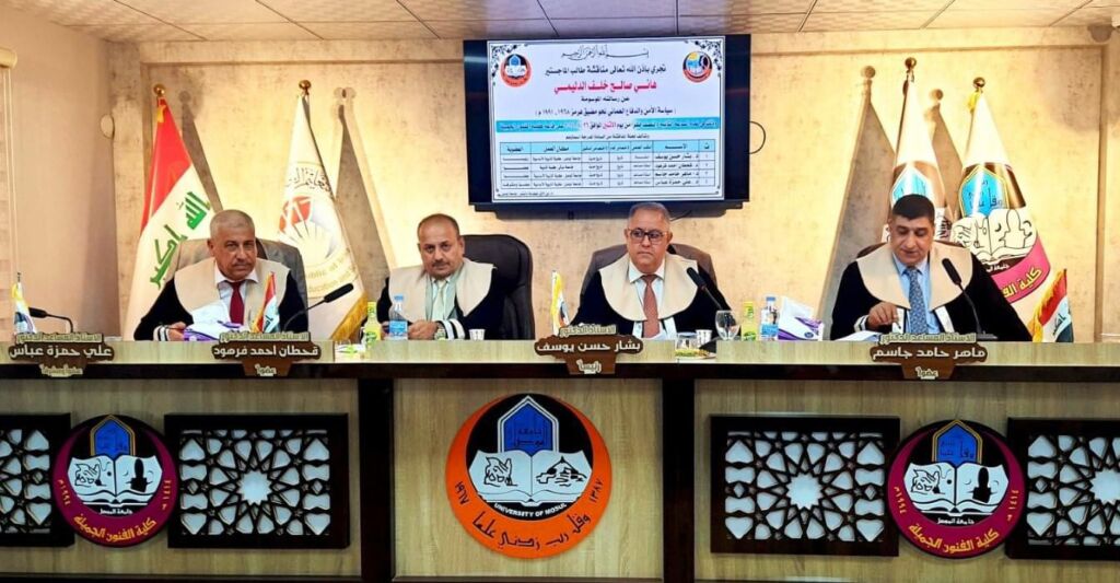 ترأس لجنة المناقشة الاستاذ الدكتور علاء حاكم محسن وعضوية كل من الاستاذ المساعد الدكتور سبهان يونس مجيد والاستاذ المساعد الدكتور محمد خالد احمد وعضوية واشراف الاستاذ المساعد الدكتور احمد عزيز فندي.