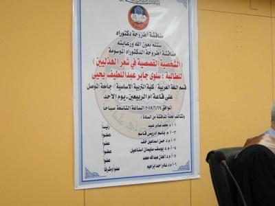 بحضور الدكتور صالح محمد حسن عميد كلية التربية الاسا سية تمت مناقشة طالبة الدكتوراه سلوى جابر عبد اللطيف يحيى من قسم اللغة العربية في كلية التربية الاساسية وعن اطروحتها الموسومة ( الشخصية القصصية في شعر الهذليين ) وذلك يوم الاحد الموافق 24/6/2018 وعلى قاعة ام الربيعين :