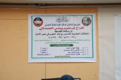 بحضور أ.م.د. صفاء الدين عبد الله سليمان عميد كلية التربية الاساسية تمت مناقشة طالبة الماجستير أفراح إبراهيم يونس الحمداني من قسم التاريخ في كلية التربية الاساسية عن رسالتها الموسومة ( العلاقات الحضارية للأندلس مع بلاد المغرب في عصر الامارة ( 138 – 316 هـ / 755 – 928 م )) ، وذلك يوم الاحد الموافق 10آذار 2019 وفي قاعة ام الربيعين في الكلية .