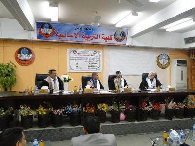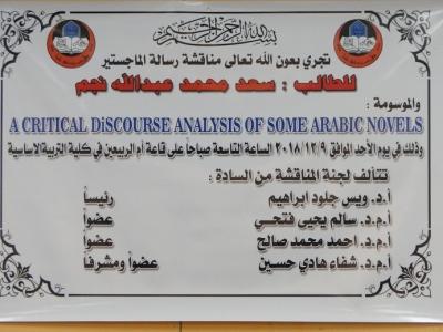بحضور الاستاذ المساعد صفاء الدين عبد الله سليمان عميد كلية التربية الاساسية تمت مناقشة طالب الماجستير سعد محمد عبد الله من قسم اللغة الانكليزية في كلية التربية الاساسية وذلك يوم الاربعاء الموافق 21/11/2018 وفي قاعة ام الربيعين في الكلية .