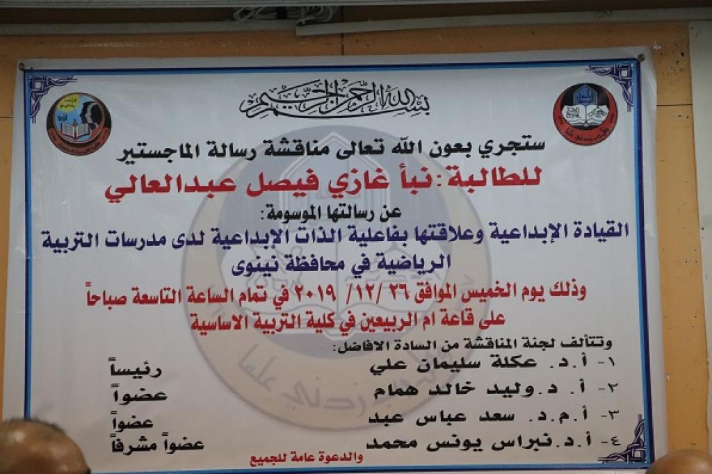 بحضور الاستاذ الدكتور صالح محمد حسن عميد كلية التربية الاساسية ومعاوني العميد الاستاذ الدكتور محمد توفيق عثمان والدكتور محمد يونس صالح تمت مناقشة طالبة الماجستير نبأ غازي فيصل عبد العالي من قسم التربية البدنية وعلوم الرياضة في كلية التربية الاساسية وذلك عن رسالتها الموسومة ( القيادة الابداعية وعلاقتها بفاعلية الذات الابداعية لدى مدرسات التربية الرياضية في محافظة نينوى ) وذلك يوم الخميس الموافق 26/12/2019 . وعلى قاعة ام الربيعين في الكلية ، وتألفت لجنة المناقشة من :
