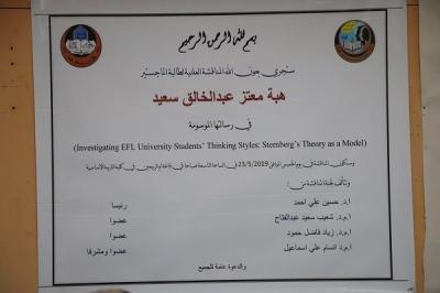 بحضور أ.م.د. صفاء الدين عبد الله سليمان عميد كلية التربية الاساسية و أ.د.. محمد توفيق عثمان معاون العميد للشؤون العلمية والدكتور محمد يونس صالح معاون العميد للشؤون الادارية تم مناقشة طالبة الماجستير هبة معتز عبد الخالق سعيد من قسم اللغة الانكليزية في كلية التربية الاساسية وذلك في يوم الخميس الموافق 23/5/2019 في قاعة ام الربيعين في الكلية .