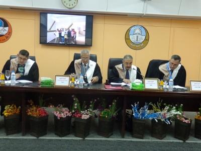 جرت في قاعة ام الربيعين في كلية التربية الاساسية يوم الاثنين الموافق 11/ 11/ 2013 مناقشة طالب الماجستير احمد عناد جرجيس عن رسالته الموسومة " اثر استخدام الأجهزة المساعدة في عدد من المتغيرات البدنية والمهارية للملاكمين المتقدمين "باشراف أ. د. أ. د. معتز يونس ذنون .