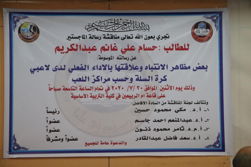 بحضور الاستاذ المساعد الدكتور صفاء الدين عبد الله سليمان عميد كلية التربية الاساسية والاستاذ الدكتور محمد توفيق عثمان معاون العميد للشؤون العلمية جرت في هذا اليوم الاثنين الموافق 20/7/2020 مناقشة طالب الماجستير حسام علي غانم من قسم التربية البدنية وعلوم الرياضة في كلية التربية الاساسية عن رسالته الموسومة ( بعض مظاهر الانتباه وعلاقتها بالاداء الفعلي لدى لاعبي كرة السلة وحسب مراكز اللعب ) وتألفت لجنة المناقشة من السادة الأفاضل :