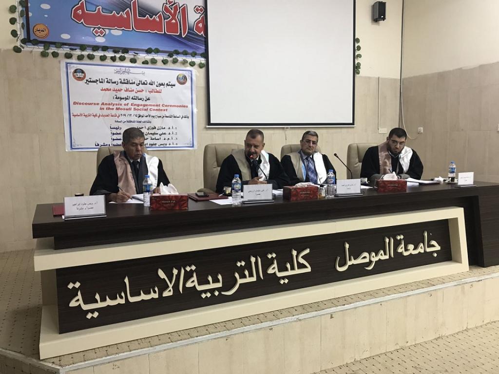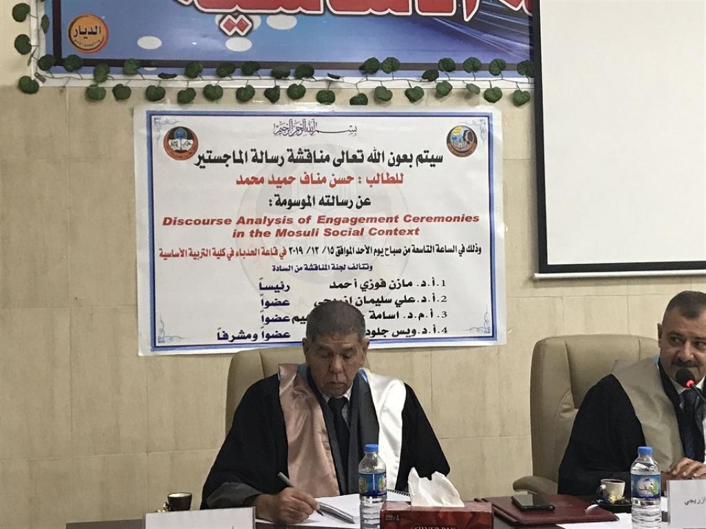 بحضور أ.د. محمد توفيق عثمان عميد كلية التربية الاساسية و أ.م.د. صفاء الدين عبد الله سليمان تمت مناقشة طالب الماجستير حسن مناف حميد من قسم اللغة الانكليزية في كلية التربية الاساسية وذلك يوم الاحد الموافق 15/12/2019 .