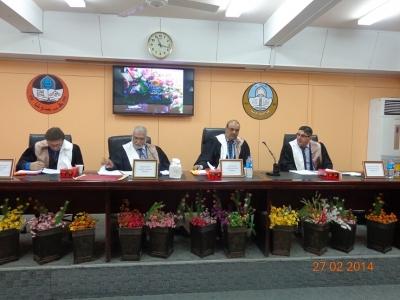 جرت في قاعة ام الربيعين في كلية التربية الاساسية يوم الخميس الموافق 27/ 2/ 2014 مناقشة طالب الماجستير في كلية التربية الأساسية محمود عمار سالمعن رسالته الموسومة (" دراسة مقارنة تحليلية ميكانيكية ثلاثية الابعاد في خطوة الركض السريع بين الرجل المسيطرة وغير المسيطرة ") وباشراف ا.م.د. ثائر غانم حمدون .