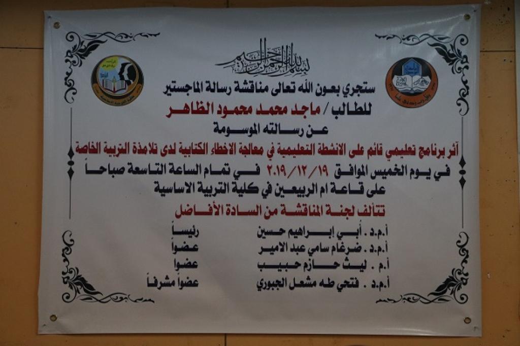 بحضور الاستاذ الدكتور صالح محمد حسن ارديني عميد كلية التربية الاساسية تمت مناقشة طالب الماجستير ماجد محمد محمود من قسم التربية الخاصة في كلية التربية الاساسية عن رسالته الموسومة ( أثر برنامج تعليمي قائم على الانشطة التعليمية في معالجة الاخطاء التعليمية لدى تلامذة التربية الخاصة ) وذلك يوم الخميس الموافق 19/12/2019 .
