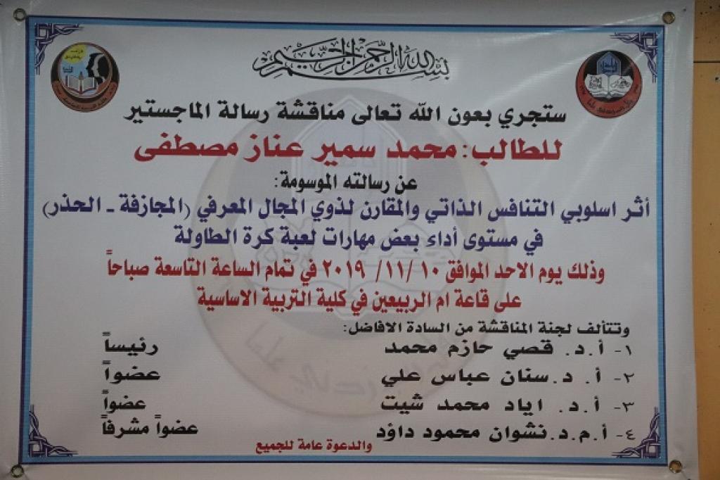 بحضور أ.د. محمد توفيق عثمان الحسين آغا وكيل عميد كلية التربية الاساسية تمت مناقشة طالب الماجستير محمد سمير عناز من قسم التربية البدنية وعلوم الرياضة في كلية التربية الاساسية وذلك عن رسالته الموسومة (( اثر اسلوبي التنافس الذاتي والمقارن لذوي المجال المعرفي ( المجازفة – الحذر ) في مستوى اداء بعض مهارات لعبة كرة الطاولة )) وذلك يوم الاحد الموافق 10/11/2019 وعلى قاعة ام الربيعين في الكلية .