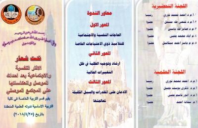 تحت شعار ( الاثار النفسية والاجتماعية بعد احداث الموصل وانعكاساتهاعلى المجتمع الموصلي ) يقيم قسم التربية الخاصة في كلية التربية الاساسية ندوته العلمية والتي ستعقد في يوم الاربعاء الموافق 25/4/2018 وعلى قاعة ام الربيعين في الكلية .ملاحظة ( يكون التسجيل من الان عند سكرتير القسم في الكلية )