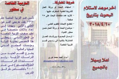 تحت شعار ( الاثار النفسية والاجتماعية بعد احداث الموصل وانعكاساتها على المجتمع الموصلي ) يقيم قسم التربية الخاصة في كلية التربية الاساسية ندوته العلمية المنعقدة بتاريخ 25/4/2018 والتفاصيل في الفولدر في ادناه :