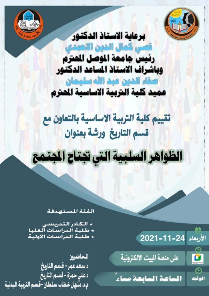 برعاية الأستاذ الدكتور قصي كمال الدين الاحمدي رئيس جامعة الموصل المحترم وبإشراف الأستاذ المساعد الدكتور صفاء الدين عبد الله سليمان عميد كلية التربية الأساسية المحترم أقامت وحدة التعليم المستمر في كلية التربية الاساسية ندوة علمية بالتعاون مع قسم التربية الاسلامية تحت عنوان ( التعايش السلمي ) وذلك في الساعة الخامسة من مساء يوم الاثنين الموافق 22/11/2021 وعلى رابط منصة Meet الالكترونية حاضر فيها الأستاذ الدكتور يوسف الطحان التدريسي في قسم التربية الإسلامية والأستاذ الدكتور دكتور حارث حازم حموشي معاون عميد كلية الاداب للشؤون العلمية . تناولت الندوة دور التعايش السلمي في التنمية الاجتماعية حيث ان السلم المجتمعي هي ظاهرة بشرية كما ان التنمية الاجتماعية ظاهرة بشرية والسلم هو حالة الوئام الإنسانية داخل بيئة المجتمع ، وتناولت محاضرة الدكتور يوسف تعاليم الدين الإسلامي الحنيف الذي هو دين سلام ومباديء له سياسيته الداخلية والخارجية التي يعيش في ظلالها الناس جميعاً لاسيما وهي تركز في تعاملاتها على حفظ كرامة الانسان والاحترام لحقوق المسلم وغيره وهي مبنية على العدالة والمساواة حيث هناك الكثير ممن الشواهد التي تدل على ان الإسلام هو دين التعايش السلمي والدليل في الايات الكريمة والاحاديث النبوية الشريفة . وامتاز الاسلام برعاية الانسانية من حيث العموم ؛ وأصحاب الديانات السماوية من حيث الخصوص ، فبسط الله تعالى به روح الانتماء بين البشر ، والّف به بين الفئات المختلفة ، ونشر به روح العدل والاحسان بين الناس كافة ؛ فالتعايش السلمي أواصره كثيرة ؛ وسبله وفيرة والمسلم يدرك أن الحياة تسع الجميع ؛ وأن الأفكار قابلة للنقاش وأن العمر لاينبغي أن يضيع في ظلال الحروب والخلافات والتناحر والتنافر لتذوق البشرية لذة العيش في ظلال السلام والإسلام .