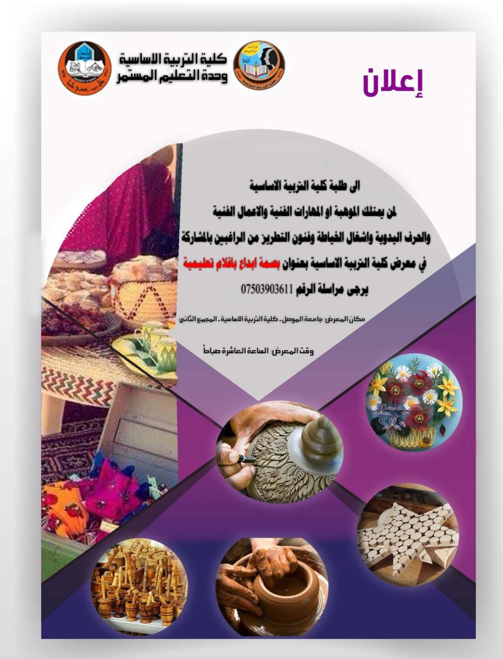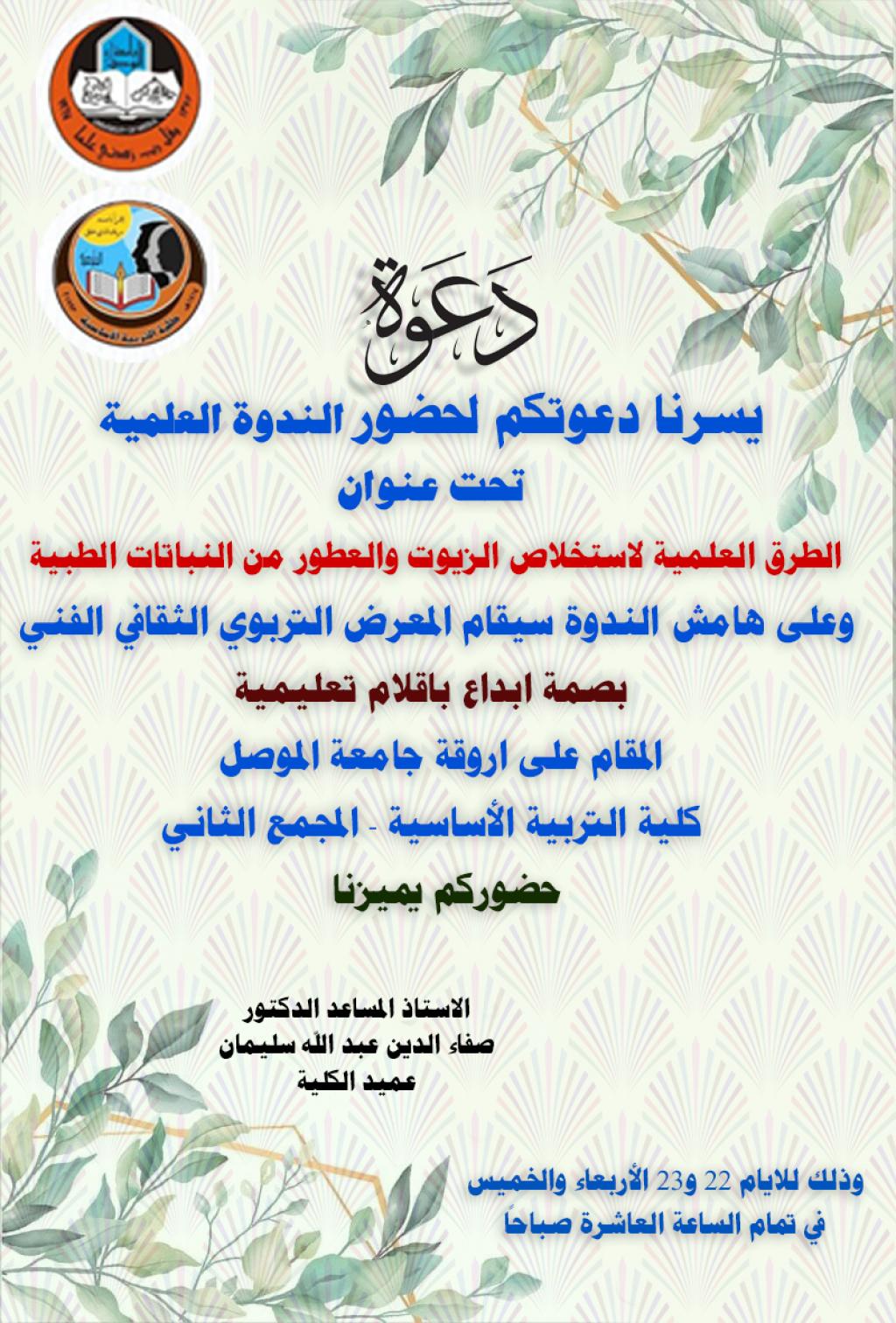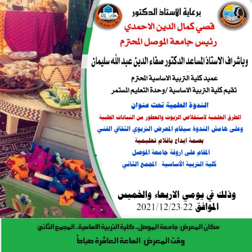 برعاية الأستاذ الدكتور قصي كمال الدين الاحمدي رئيس جامعة الموصل المحترم وبإشراف الأستاذ المساعد الدكتور صفاء الدين عبد الله سليمان عميد كلية التربية الأساسية المحترم تقيم وحدة التعليم المستمر في كلية التربية الاساسية ندوة علمية بالتعاون مع قسم العلوم العامة تحت عنوان ( إستخلاص الزيوت والعطور من النباتات الطبيعية ) وذلك في الساعة العاشرة من صباح يوم الاربعاء الموافق 22/12/2021 وعلى قاعة ام الربيعين في الكلية ، وعلى هامش الندوة سيقام المعرض التربوي الفني ( بصمة إبداع بأقلام تعليمية ) وذلك بالساعة العاشرة من يومي اربعاء والخميس الموافق 22 – 23/12/2021 وعلى أروقة كلية التربية الأساسية.